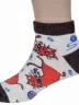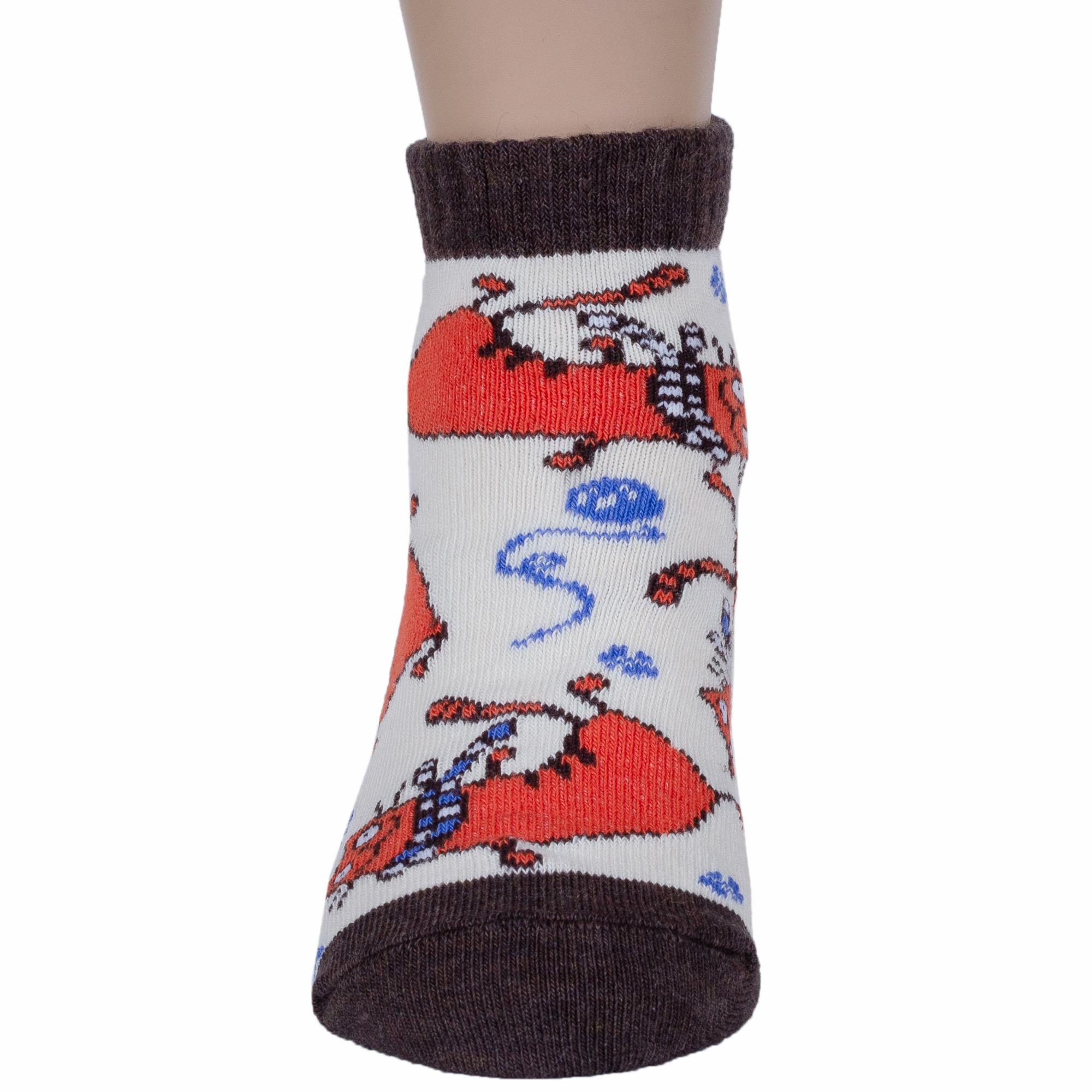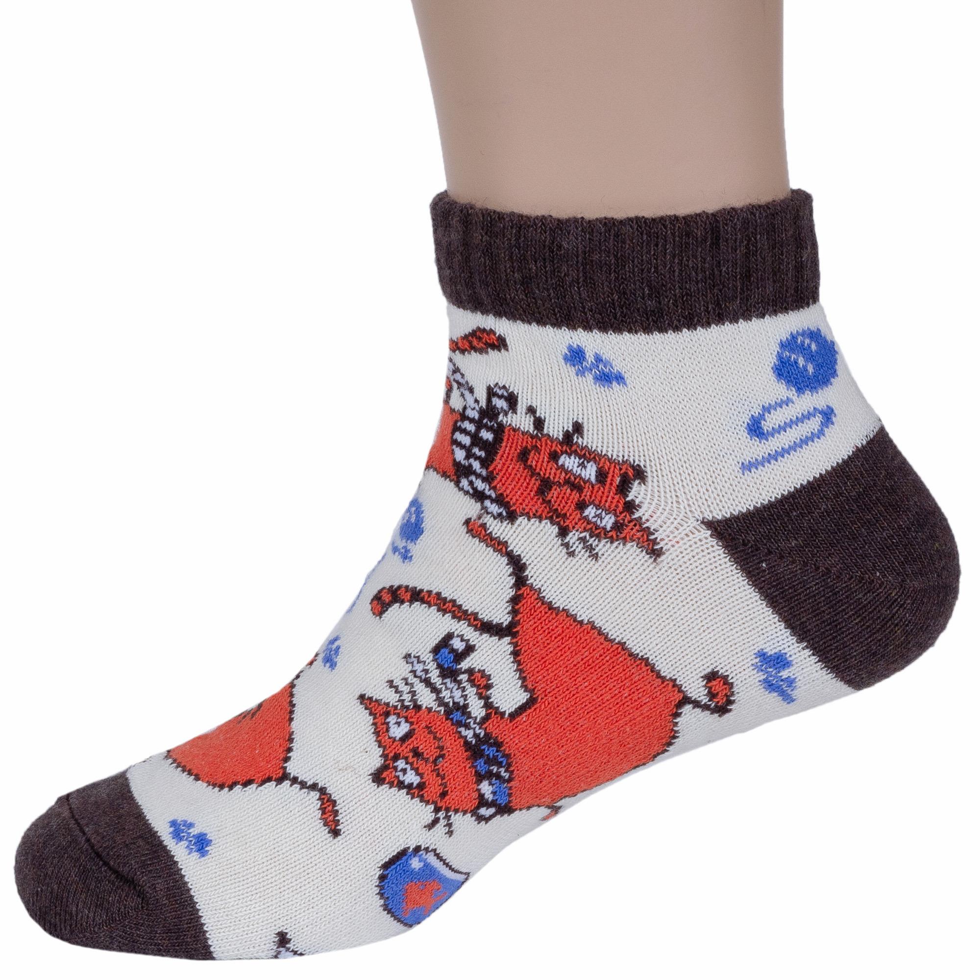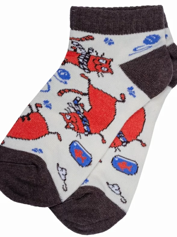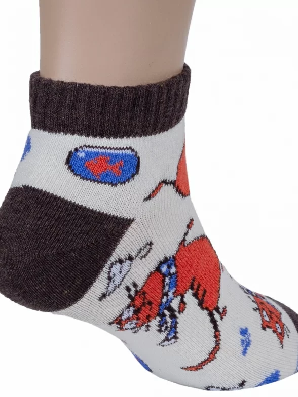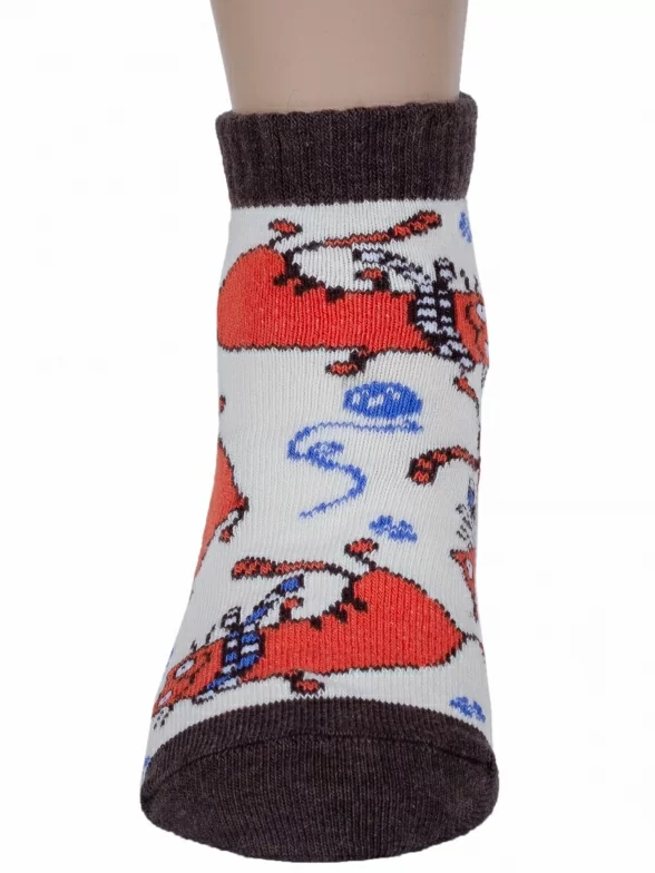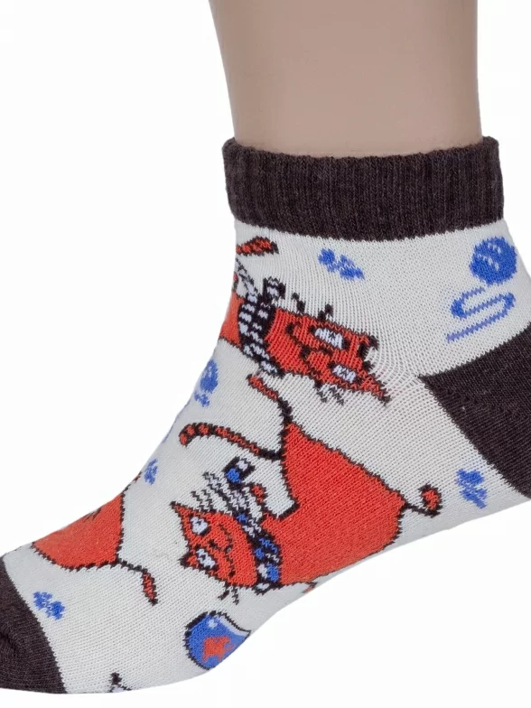 Короткие детские носки от Бресткого Чулочного Комбината связаны из пряжи на основе хлопка. Модель украшена принтом в виде котов. Пятка и мысок контрастные.