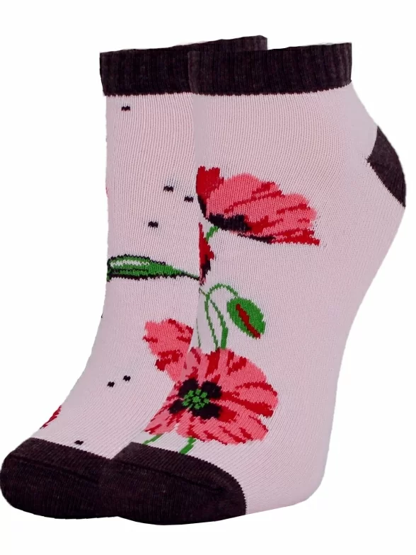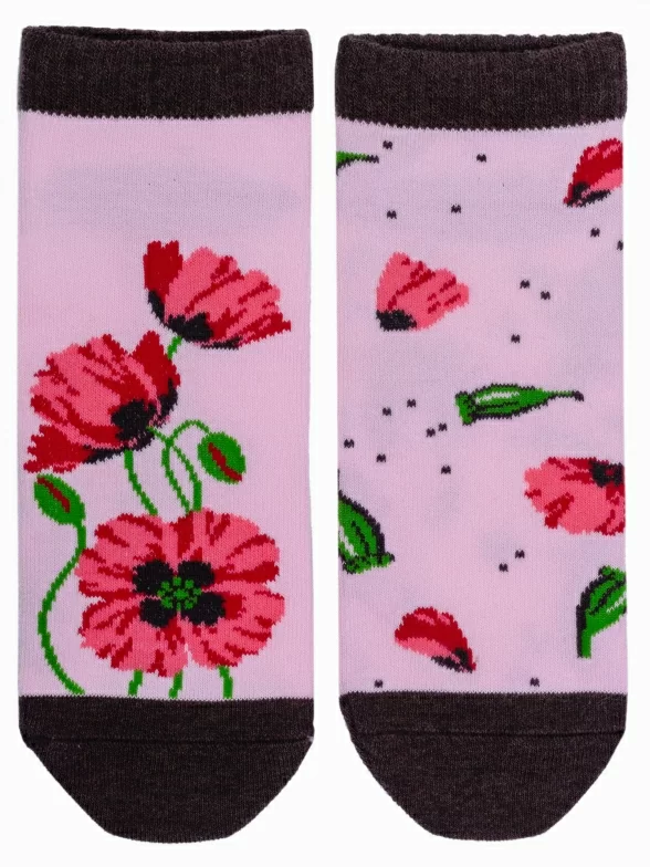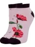 Детские короткие носки связаны из пряжи на основе хлопка. Модель украшена крупным цветочным рисунком.