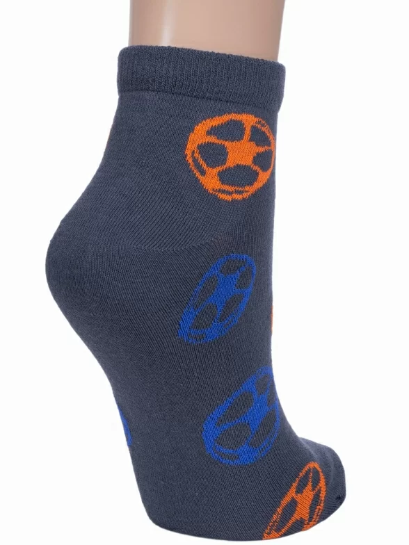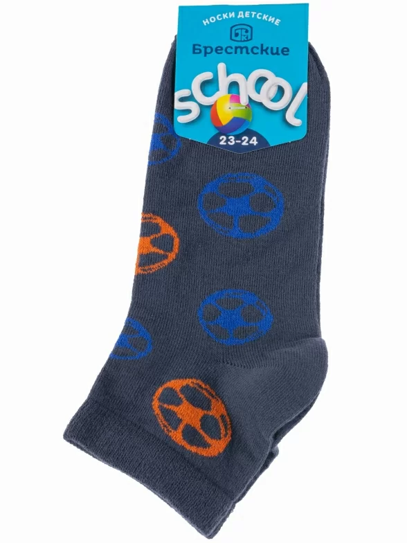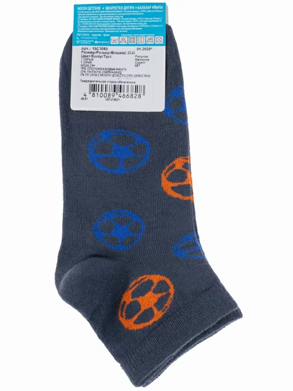 Летние короткие детские носки, цвет темно-серый, спортивные, повседневные, шов обычный (не бесшовные), принт (рисунок): спортивные, игры, с узором, крупные контрастные рисунки, состав: 74% хлопок, 24% полиамид, 2% эластан, арт. 15С3085. Производитель «Брестский чулочный комбинат ОАО, Беларусь» под брендом «Брестские (бчк)».