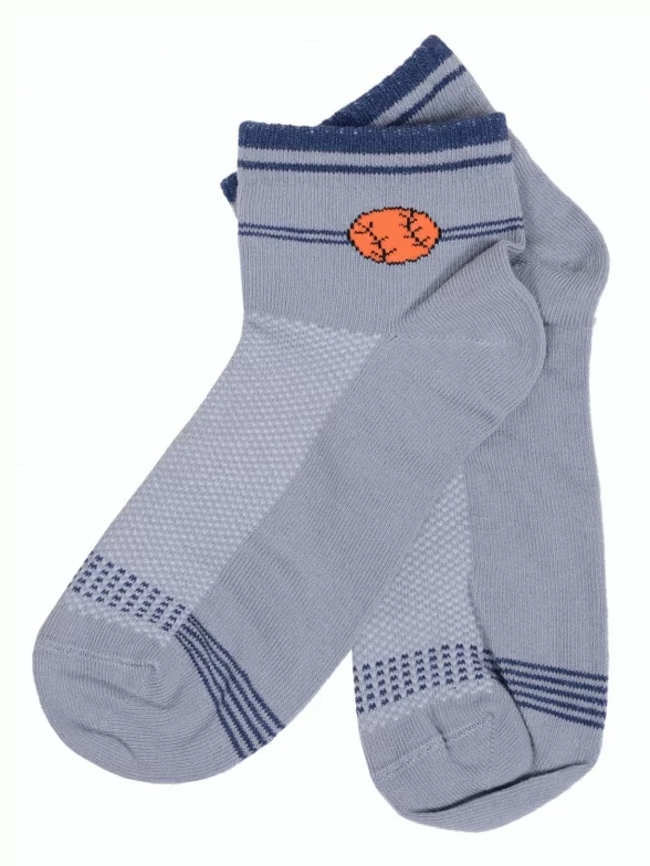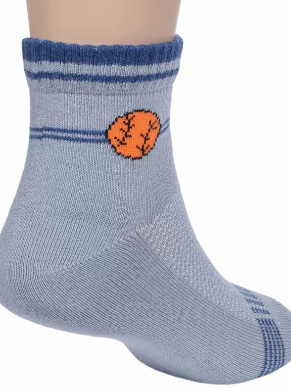 Детские короткие носки от Бресткого Чулочного Комбината связаны из пряжи на основе хлопка. Модель украшена принтом в виде мяча и полосок.