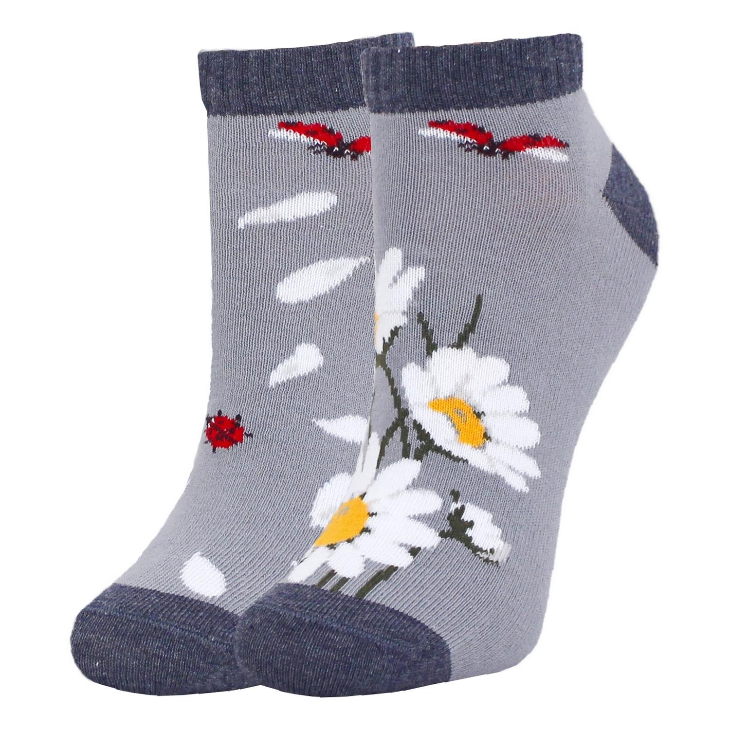Детские короткие носки связаны из пряжи на основе хлопка. Модель украшена крупным цветочным рисунком.