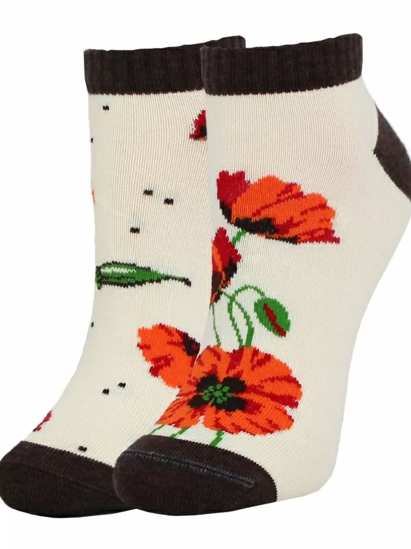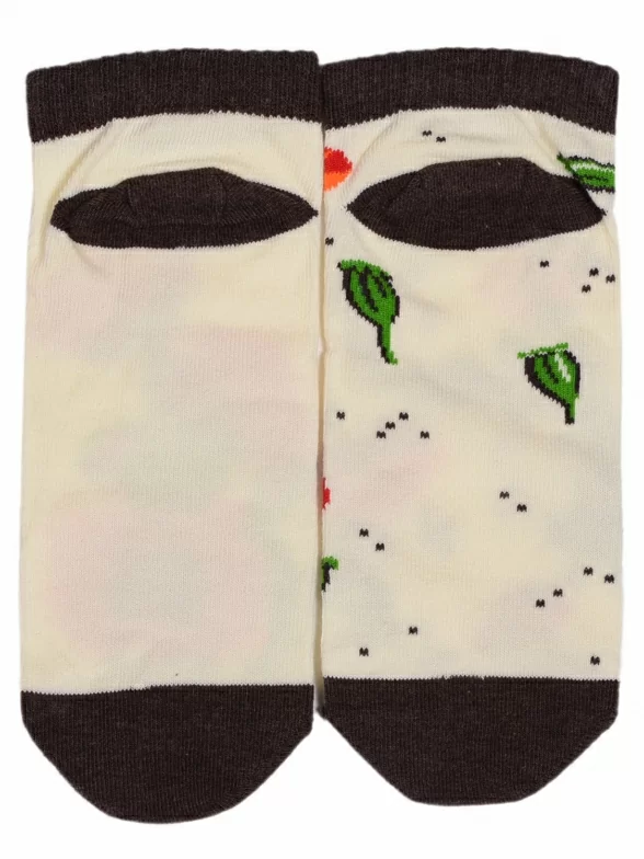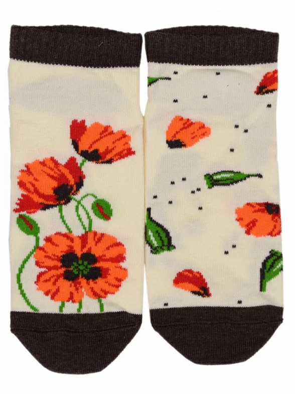 Детские короткие носки связаны из пряжи на основе хлопка. Модель украшена крупным цветочным рисунком.