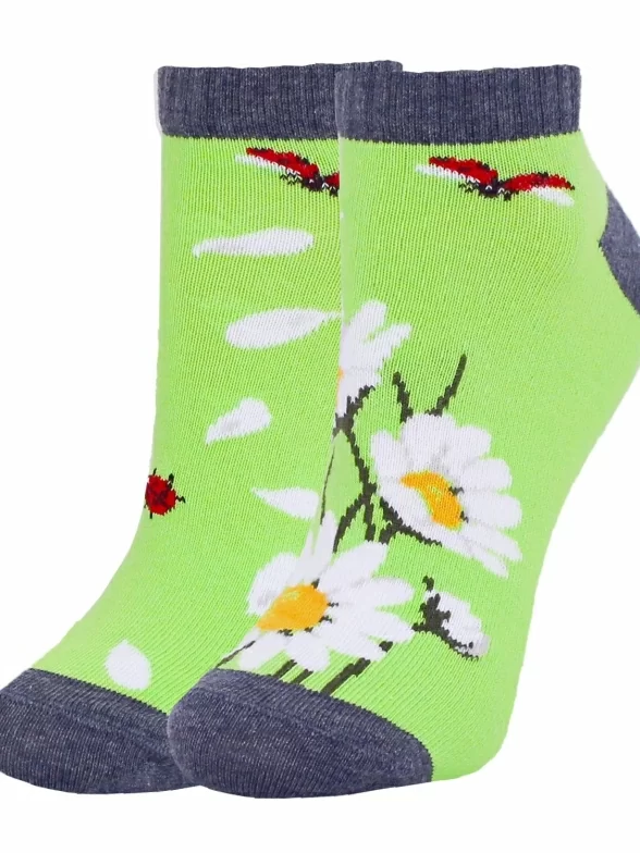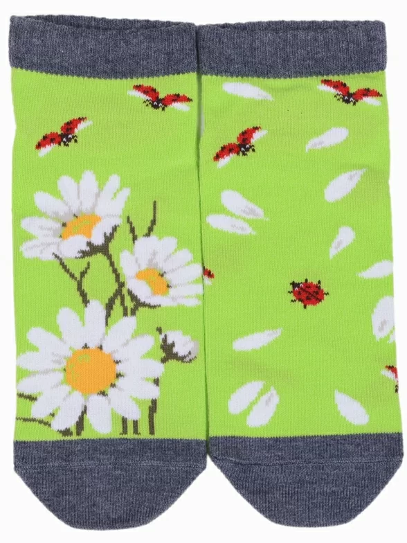 Детские короткие носки связаны из пряжи на основе хлопка. Модель украшена крупным цветочным рисунком.