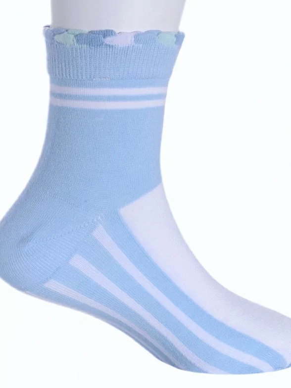 Круглогодичные укороченные детские носки, цвет голубой, классические, шов обычный (не бесшовные), принт (рисунок): спортивные, полоски, с узором, состав: 90% хлопок, 7% полиамид, 3% эластан (лайкра), арт. Л1. Производитель «ИП Мурзаков В.А., Ставропольский край, Россия» под брендом «Lorenzline».