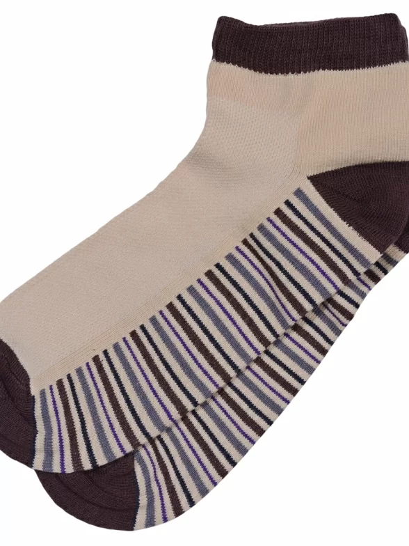 Короткие детские носки с сетчатой вязкой на подъеме. Они сделаны из качественного трикотажа с высоким содержанием хлопка и оформлены контрастными элементами, а также полоской на стопе.