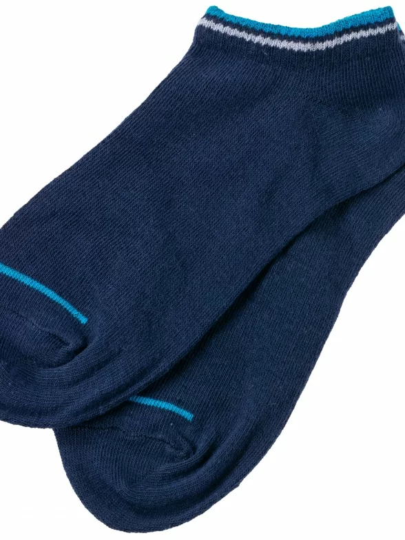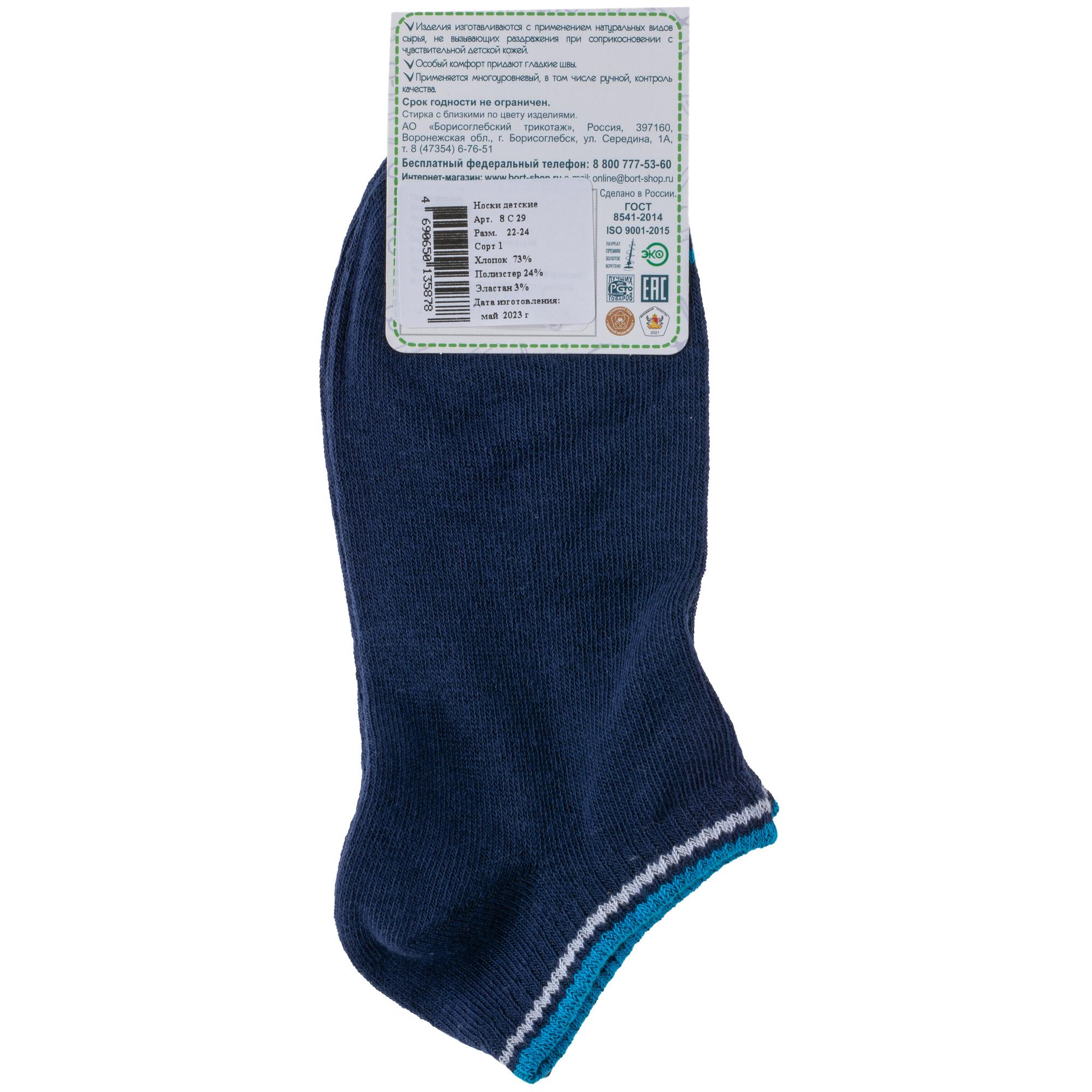 Круглогодичные ультракороткие детские носки, цвет синий, спортивные, шов обычный (не бесшовные), принт (рисунок): контрастные пятка / мысок / резинка, однотонный, состав: 73% хлопок, 24% полиэстер, 3% эластан, арт. 8С29. Производитель «АО Борисоглебский трикотаж, Воронежская обл, Россия» под брендом «Борисоглебский трикотаж».