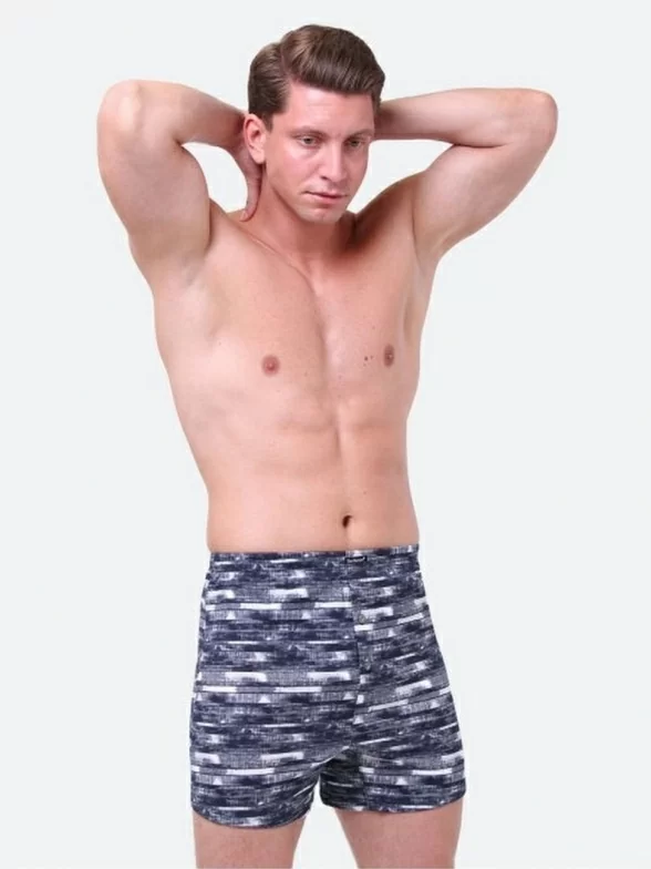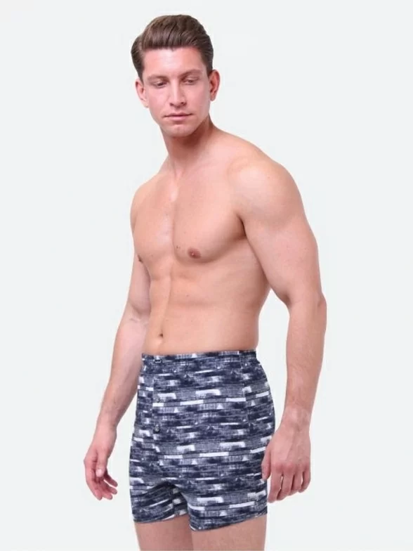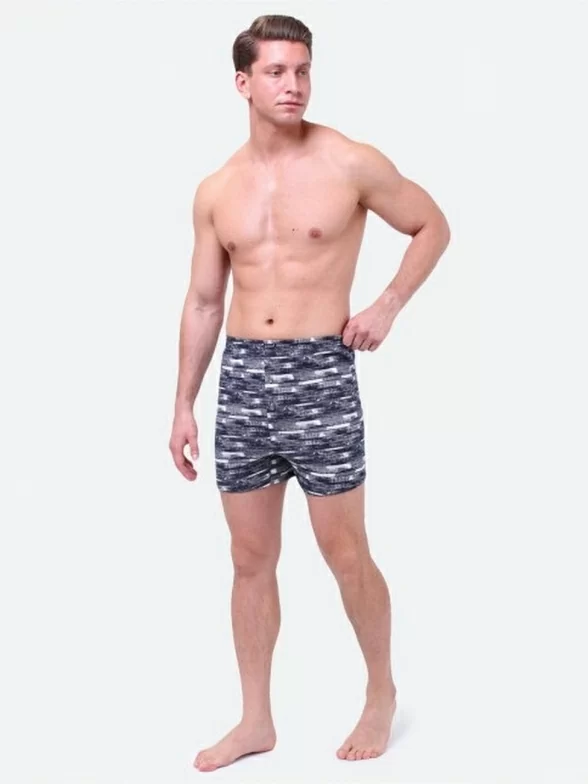 Удлиненные мужские боксеры с оригинальным принтом. Модель облегающего фасона со втачным поясом-резинкой. Отличительная особенность трусов – гульфик с застежкой на 2 пуговицы.
