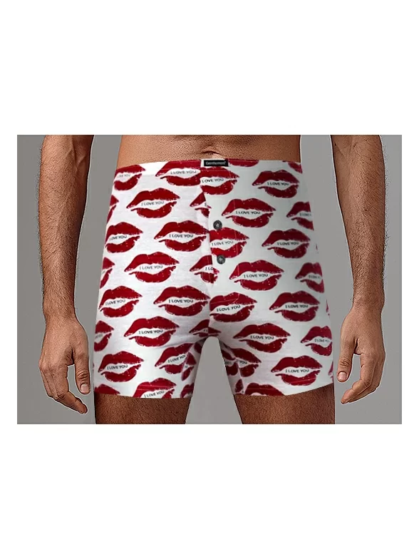 Очень оригинальные трусы-боксеры с принтом в виде отпечатков помады. Они сделаны из 100-процентного хлопка и отличаются удобным втачным поясом, а также гульфиком на двух пуговицах.