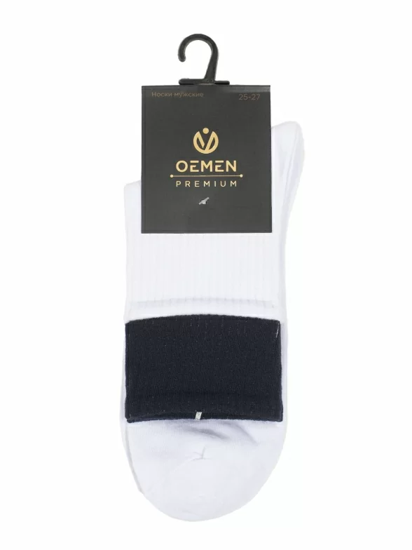 Круглогодичные средней длины мужские носки, цвет белый, спортивные, шов обычный (не бесшовные), принт (рисунок): в рубчик, однотонный, состав: 97% хлопок, 2% полиамид, 1% лайкра, арт. PM351. Производитель «Oemen» Китай под брендом «Oemen».