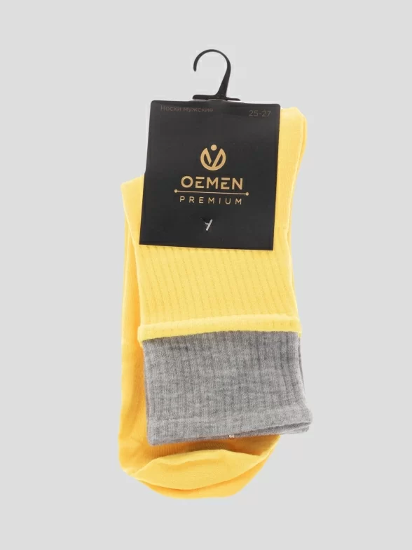 Круглогодичные средней длины мужские носки, цвет желтый, спортивные, шов обычный (не бесшовные), принт (рисунок): однотонный, в рубчик, состав: 97% хлопок, 2% полиамид, 1% лайкра, арт. PM351. Производитель «Oemen» Китай под брендом «Oemen».