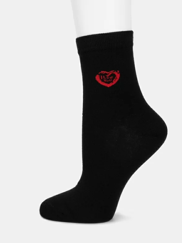Круглогодичные укороченные женские носки, цвет черный, повседневные, шов обычный (не бесшовные), принт (рисунок): сердечки / поцелуи / любовь, надписи, состав: 97% хлопок, 2% полиамид, 1% лайкра, арт. UC02. Производитель «Oemen» Китай под брендом «Oemen».