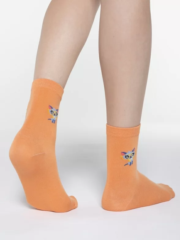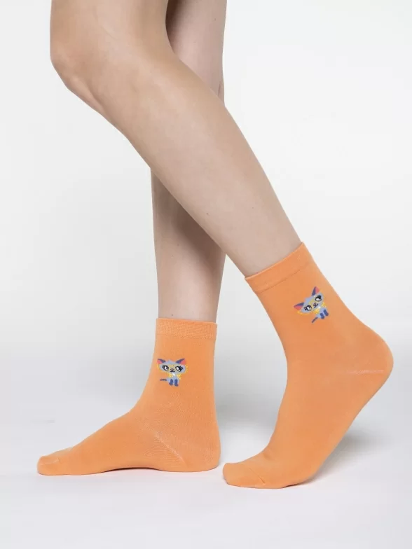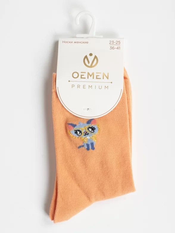 Круглогодичные укороченные женские носки, цвет оранжевый, повседневные, шов обычный (не бесшовные), принт (рисунок): животные, состав: 97% хлопок, 2% полиамид, 1% лайкра, арт. UC01. Производитель «Oemen» Китай под брендом «Oemen».