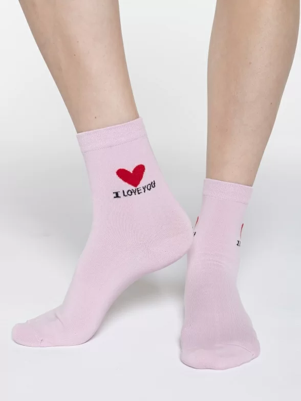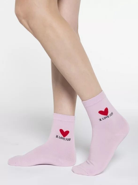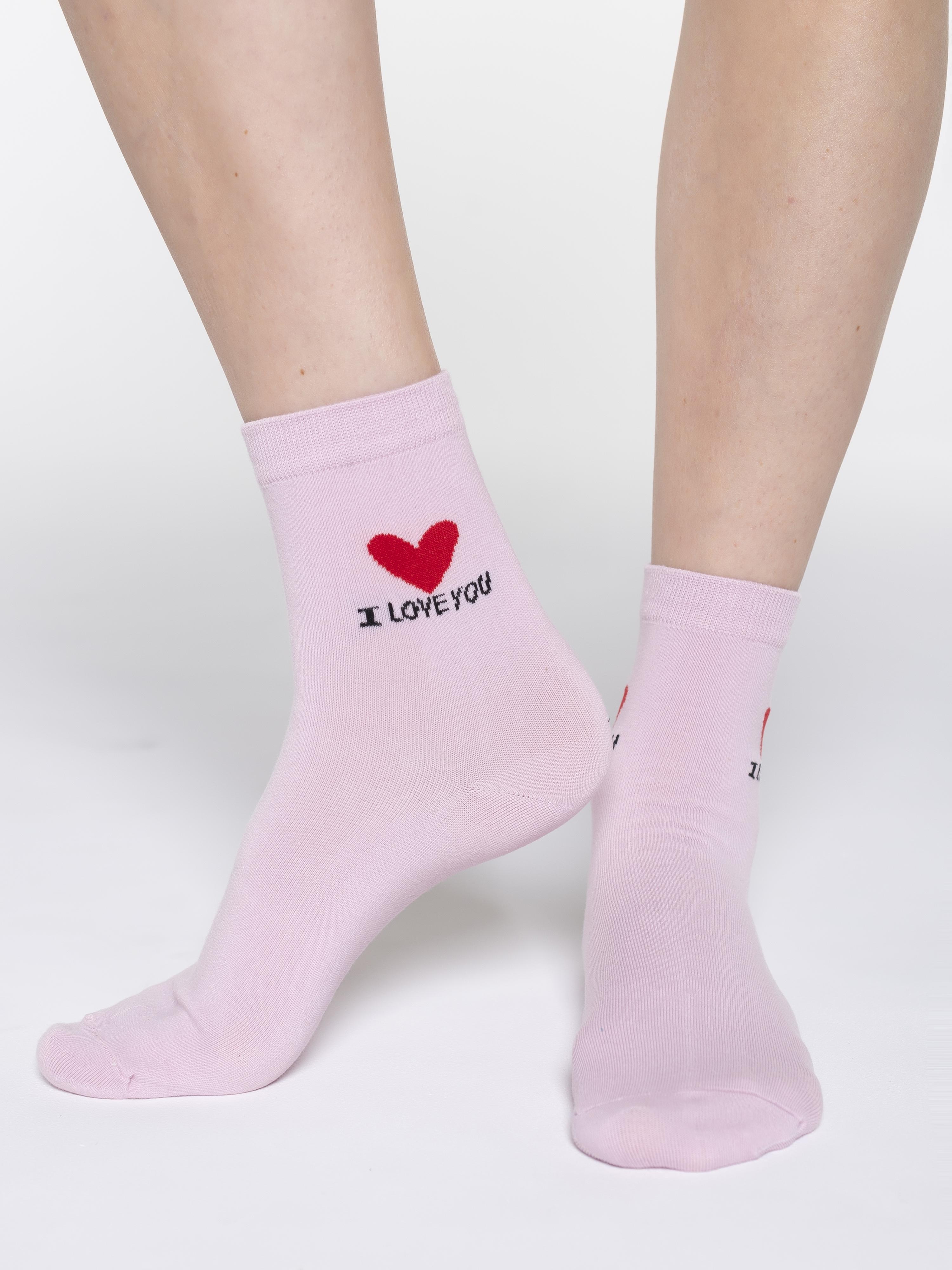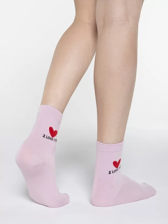 Круглогодичные укороченные женские носки, цвет розовый, повседневные, шов обычный (не бесшовные), принт (рисунок): сердечки / поцелуи / любовь, надписи, состав: 97% хлопок, 2% полиамид, 1% лайкра, арт. UC02. Производитель «Oemen» Китай под брендом «Oemen».