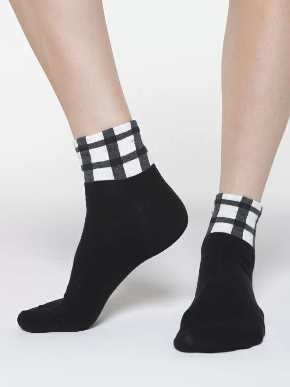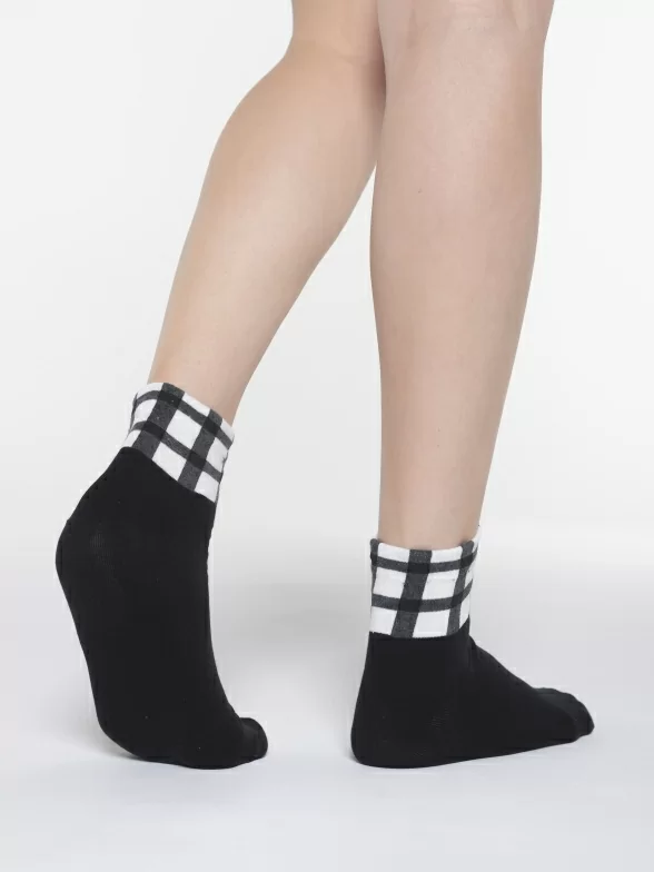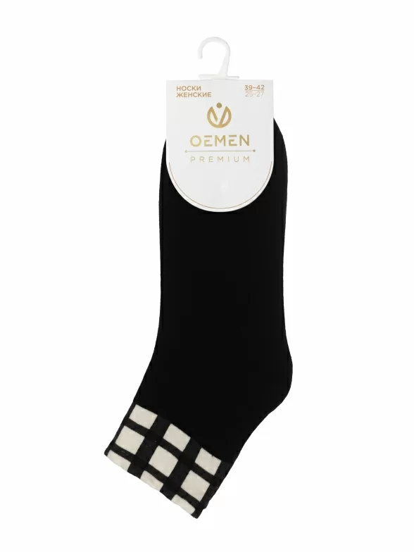 Круглогодичные укороченные женские носки, цвет черный-белый, повседневные, шов обычный (не бесшовные), принт (рисунок): клетка, состав: 97% хлопок, 2% полиамид, 1% эластан, арт. PW537. Производитель «Oemen» Китай под брендом «Oemen».