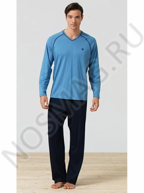 Удобный трикотажный домашний комплект одежды для мужчин. В него входят брюки свободного кроя и фуфайка с рукавом реглан и V-образным вырезом горловины. Сочетание модала и хлопка делает комплект мягким и приятным к телу, он быстро сохнет и практически не мнётся.