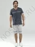 Стильный комплект для мужчин, состоящий из шорт и футболки. Футболка имеет V-образный вырез с застёжкой на пуговицах. Комплект украшен контрастными полосками, надписями и акцентирующими линиями.