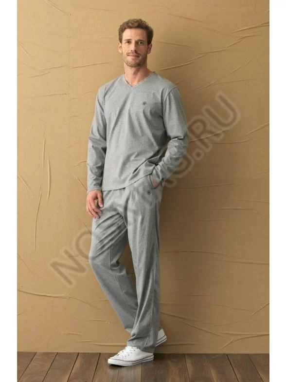Однотонная мужская пижама, также подходящая в качестве повседневной домашней одежды. Комплект состоит из фуфайки с длинным рукавом и V-образным вырезом, а также брюк свободного кроя. Содержание модала делает одежду мягкой и приятной к телу.