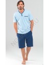 Летний мужской комплект для дома, состоящий из однотонных шорт и футболки с контрастным кантом. Футболка имеет V-образный вырез горловины, дополненный застёжкой на пуговицах. Шорт снабжены удобные боковыми карманами, на груди футболки также есть один накладной карман.