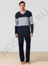 Мужской домашний комплект, состоящий из брюк свободного кроя и фуфайки с длинным рукавом и V-образным вырезом горловины. Верх украшен широкими контрастным полосами и акцентирующей отделкой выреза.