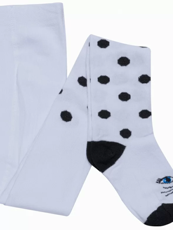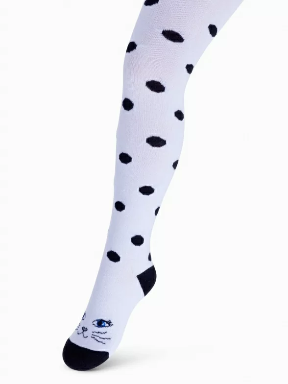 Произведены на российской фабрике "Орудьевский трикотаж". Модель с принтом в горох по всей ноге и мордочкой кота на подъеме стопы. Связаны из хлопка с добавлением полиамида и эластана для большей износостойкости и эластичности.