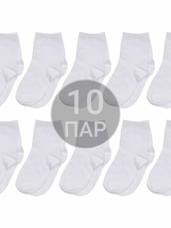 Комплект детских носков из 10 пар, круглогодичные, средней длины, цвет белый, классические, шов обычный (не бесшовные), принт (рисунок): однотонный, без рисунков/узоров, состав: 88% хлопок, 10% полиамид, 2% эластан, арт. 10-d-1227. Производитель «ХОХ» Россия под брендом «Хох».