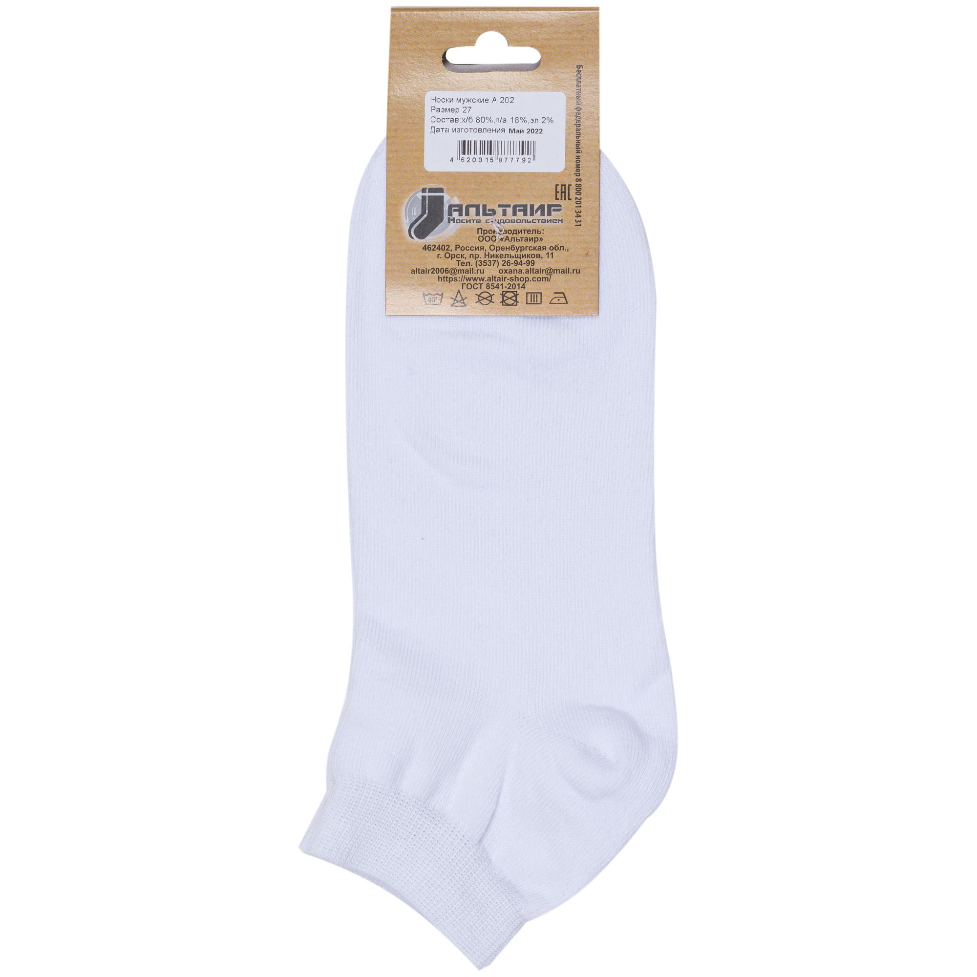 Комплект мужских носков из 10 пар, межсезонные или летние, короткие, цвет белый, классические, шов обычный (не бесшовные), принт (рисунок): однотонный, без рисунков/узоров, состав: 80% хлопок, 18% полиамид, 2% эластан, арт. 10-А202. Производитель «ООО Альтаир, г. Орск, Оренбургская обл, Россия» под брендом «Альтаир».