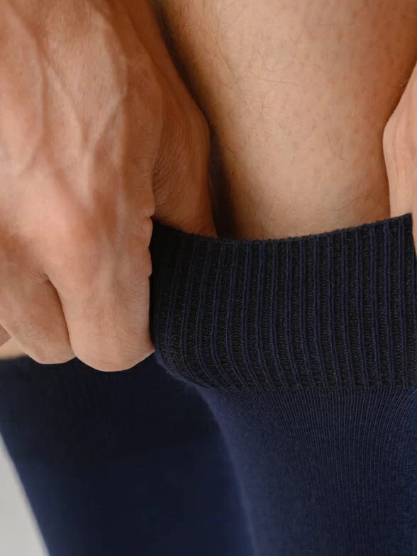 Однотонная модель средней длины с одинарным бортом (манжетом резинки) и неощутимым швом на мыске. Изготовлены на фабрике "Орудьевский трикотаж" в Московской области из хлопка с добавлением полиамида и эластана для износостойкости изделия и комфортной посадки.
