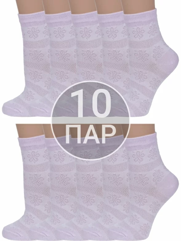 Комплект женских носков из 10 пар, летние или круглогодичные, укороченные, цвет сиреневый, повседневные, в сеточку, шов обычный (не бесшовные), принт (рисунок): цветы / растения, кружево (или имитация), с узором, состав: 80% хлопок, 18% полиамид, 2% эластан, арт. 10-С117. Производитель «ООО Альтаир, г. Орск, Оренбургская обл, Россия» под брендом «Альтаир».