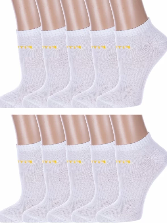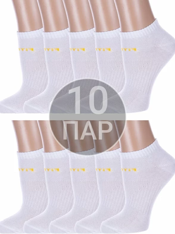 Комплект женских носков из 10 пар, круглогодичные, короткие, цвет белый с желтым, спортивные, в сеточку, шов обычный (не бесшовные), принт (рисунок): надписи, с узором, состав: 75% хлопок, 23% полиамид, 2% эластан, арт. 10-А217. Производитель «ООО Альтаир, г. Орск, Оренбургская обл, Россия» под брендом «Альтаир».
