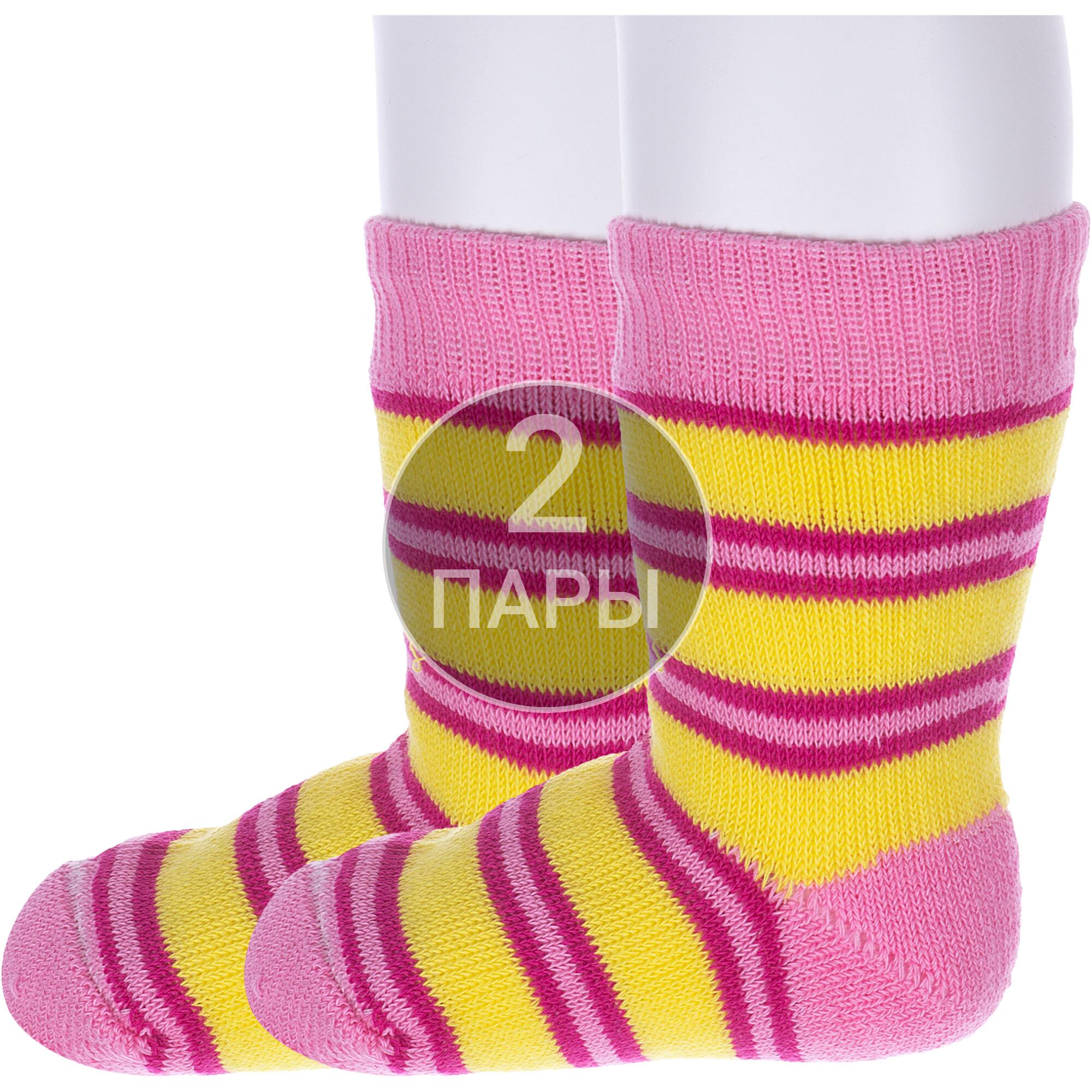 Комплект детских носков из 2 пар, межсезонные или зимние, укороченные, цвет желто-розовый, теплые, повседневные, махровые, возможно бесшовные, принт (рисунок): полоски, с узором, состав: 98% хлопок, 1.5% эластан, 0.5% полиамид, арт. 2-С114. Производитель «ООО Альтаир, г. Орск, Оренбургская обл, Россия» под брендом «Альтаир».