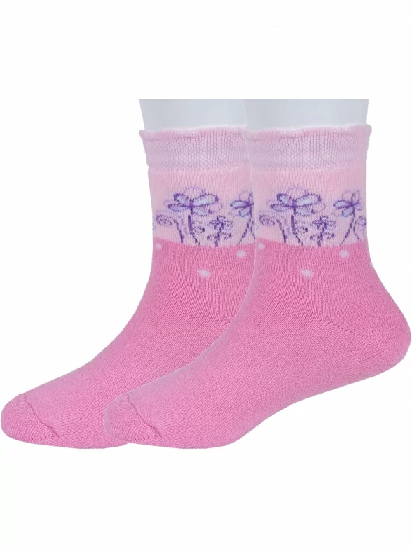 Комплект детских носков из 2 пар, зимние, укороченные, цвет светло-розовый, повседневные, махровые, теплые, шов обычный (не бесшовные), принт (рисунок): с узором, цветы / растения, состав: 86% хлопок, 13% полиамид, 1% эластан, арт. 2-С663. Производитель «ГАММА» Россия под брендом «Гамма».