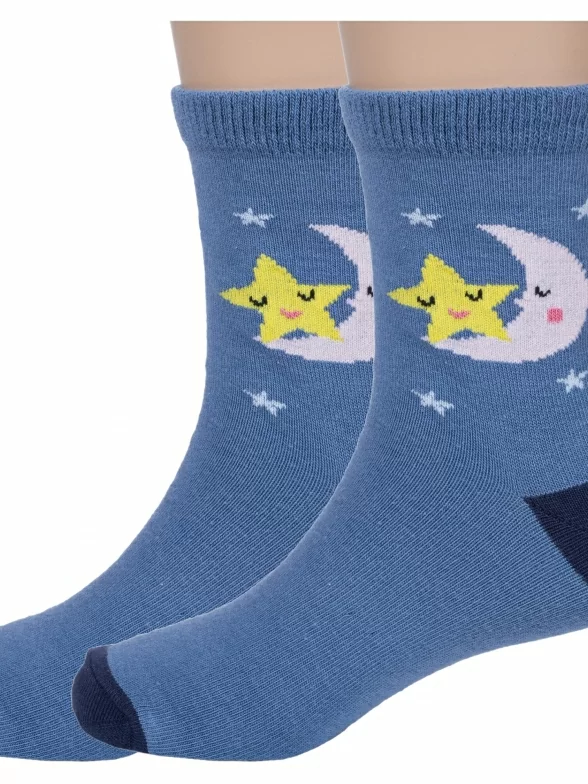 Комплект детских носков из 2 пар, круглогодичные, укороченные, цвет джинсовый, повседневные, шов обычный (не бесшовные), принт (рисунок): звезды / небо, с узором, крупные контрастные рисунки, состав: 70% хлопок, 27% полиамид, 3% эластан, арт. 2-CK41800 051. Производитель «ООО «АКОС ТЭКС», Московская область, Россия» под брендом «Akos».