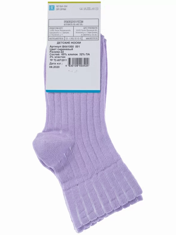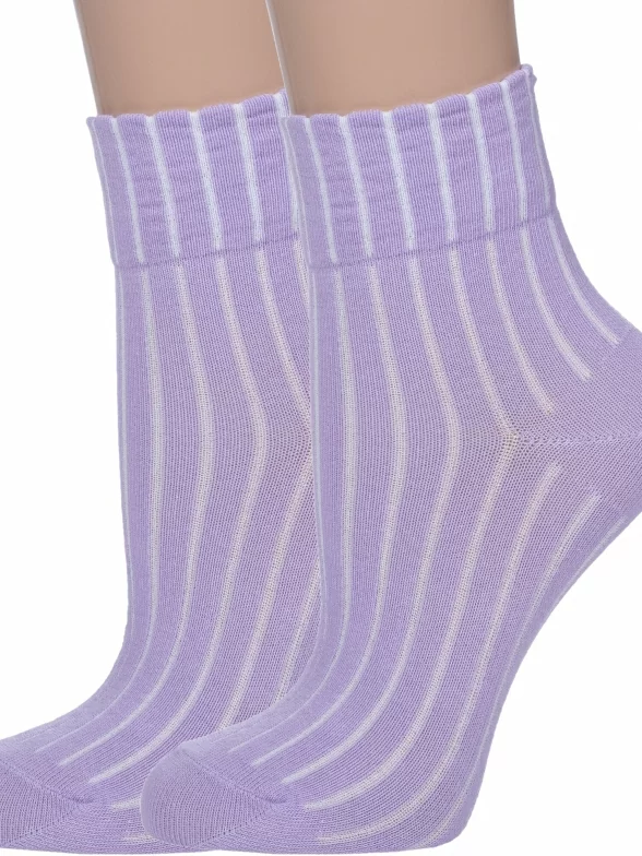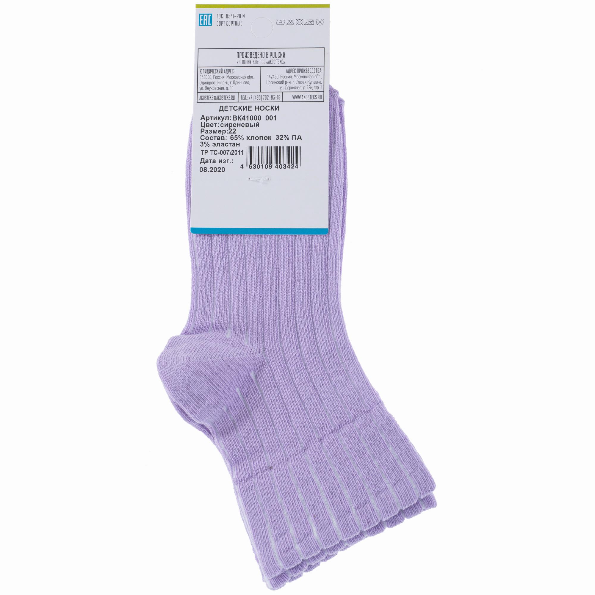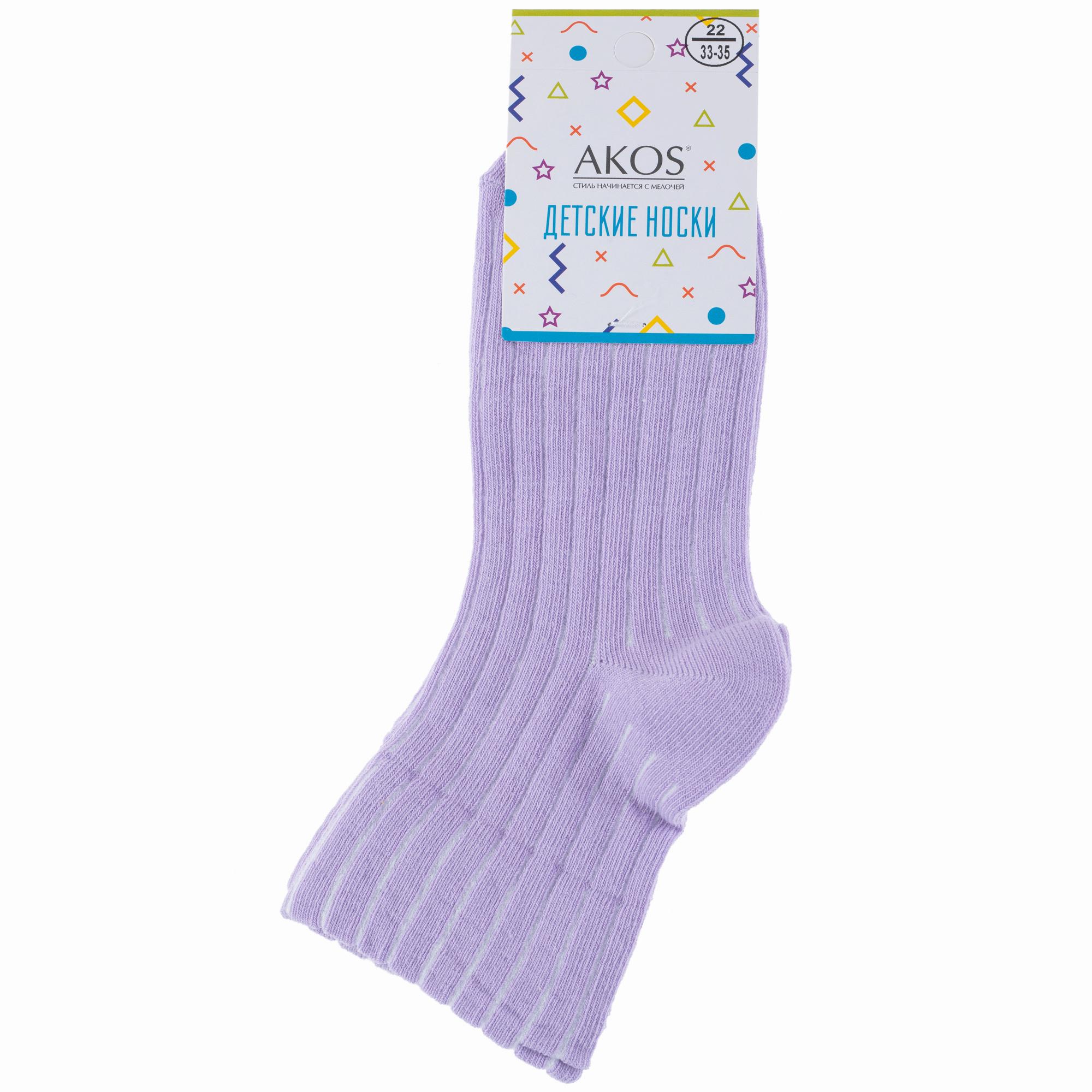 Комплект детских носков из 2 пар, круглогодичные, укороченные, цвет сиреневый, классические, шов обычный (не бесшовные), принт (рисунок): полоски, в рубчик, с узором, состав: 65% хлопок, 32% полиамид, 3% эластан, арт. 2-ВК41000 001. Производитель «ООО «АКОС ТЭКС», Московская область, Россия» под брендом «Akos».