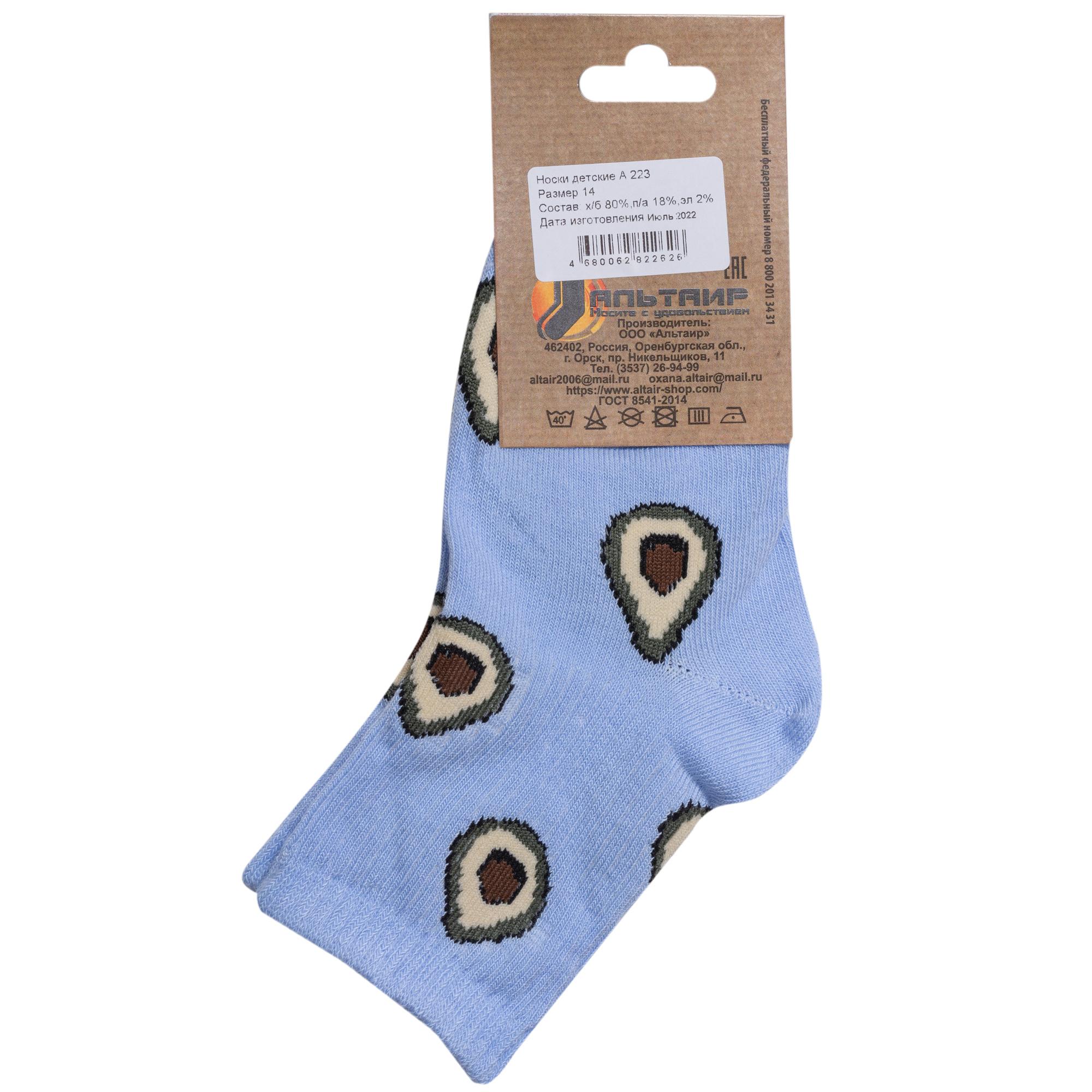 Комплект детских носков из 2 пар, круглогодичные, укороченные, цвет светло-голубой, повседневные, шов обычный (не бесшовные), принт (рисунок): ягодно-фруктовый, вкусности, с узором, состав: 80% хлопок, 18% полиамид, 2% эластан, арт. 2-А223. Производитель «ООО Альтаир, г. Орск, Оренбургская обл, Россия» под брендом «Альтаир».