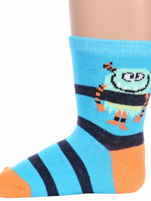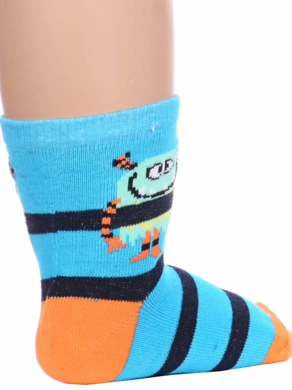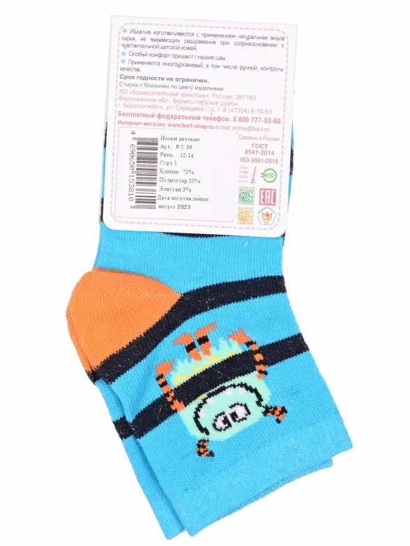 Комплект детских носков из 2 пар, круглогодичные, укороченные, цвет бирюзовый, повседневные, возможно бесшовные, принт (рисунок): полоски, контрастные пятка / мысок / резинка, с узором, состав: 72% хлопок, 25% полиэстер, 3% эластан, арт. 2-8С39. Производитель «АО Борисоглебский трикотаж, Воронежская обл, Россия» под брендом «Борисоглебский трикотаж».