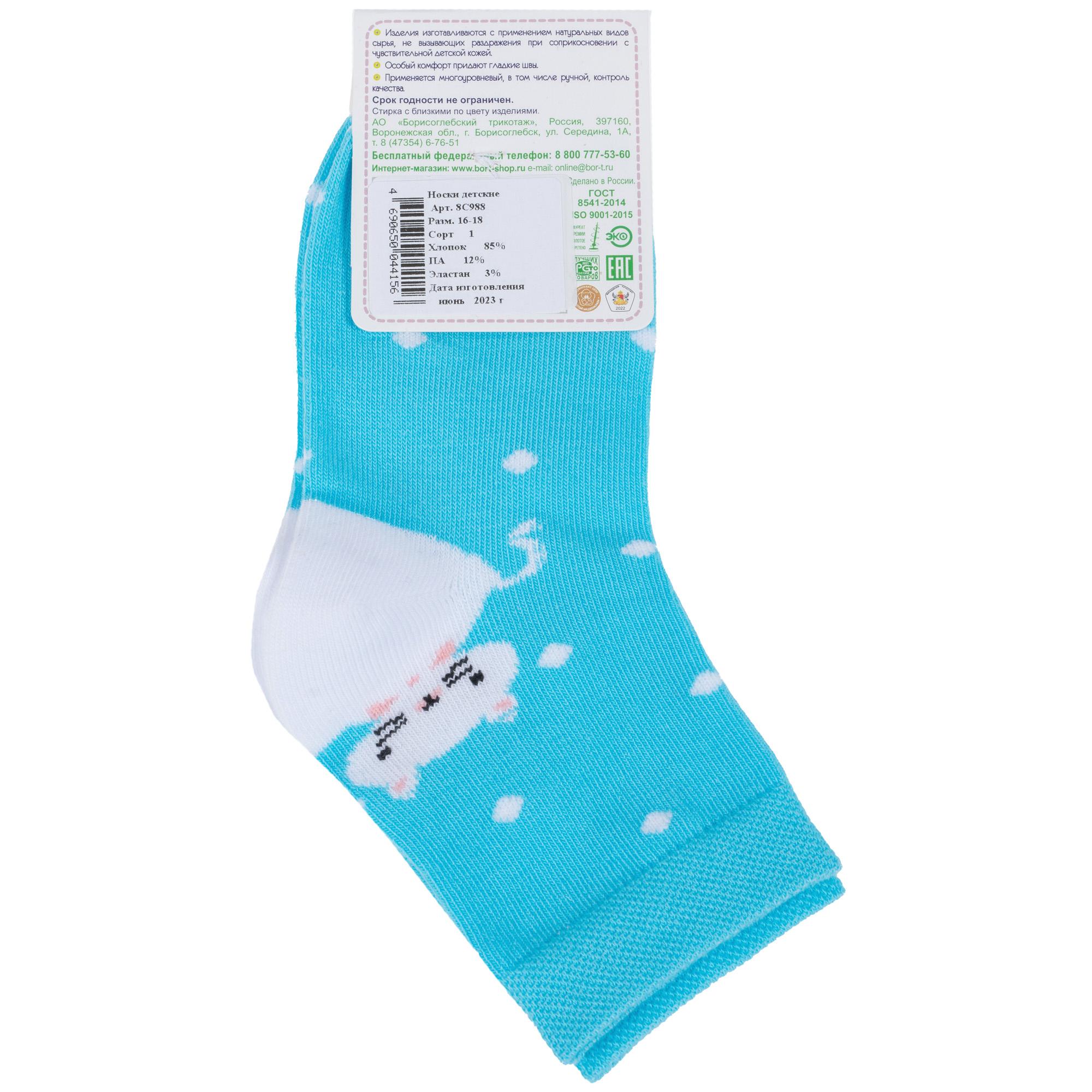 Комплект детских носков из 2 пар, круглогодичные, укороченные, цвет бирюзовый, прикольные, состав: 85% хлопок, 12% полиамид, 3% эластан, фабричный артикул 2-8С988. Производитель «АО Борисоглебский трикотаж, Воронежская обл, Россия» под брендом «Борисоглебский трикотаж».