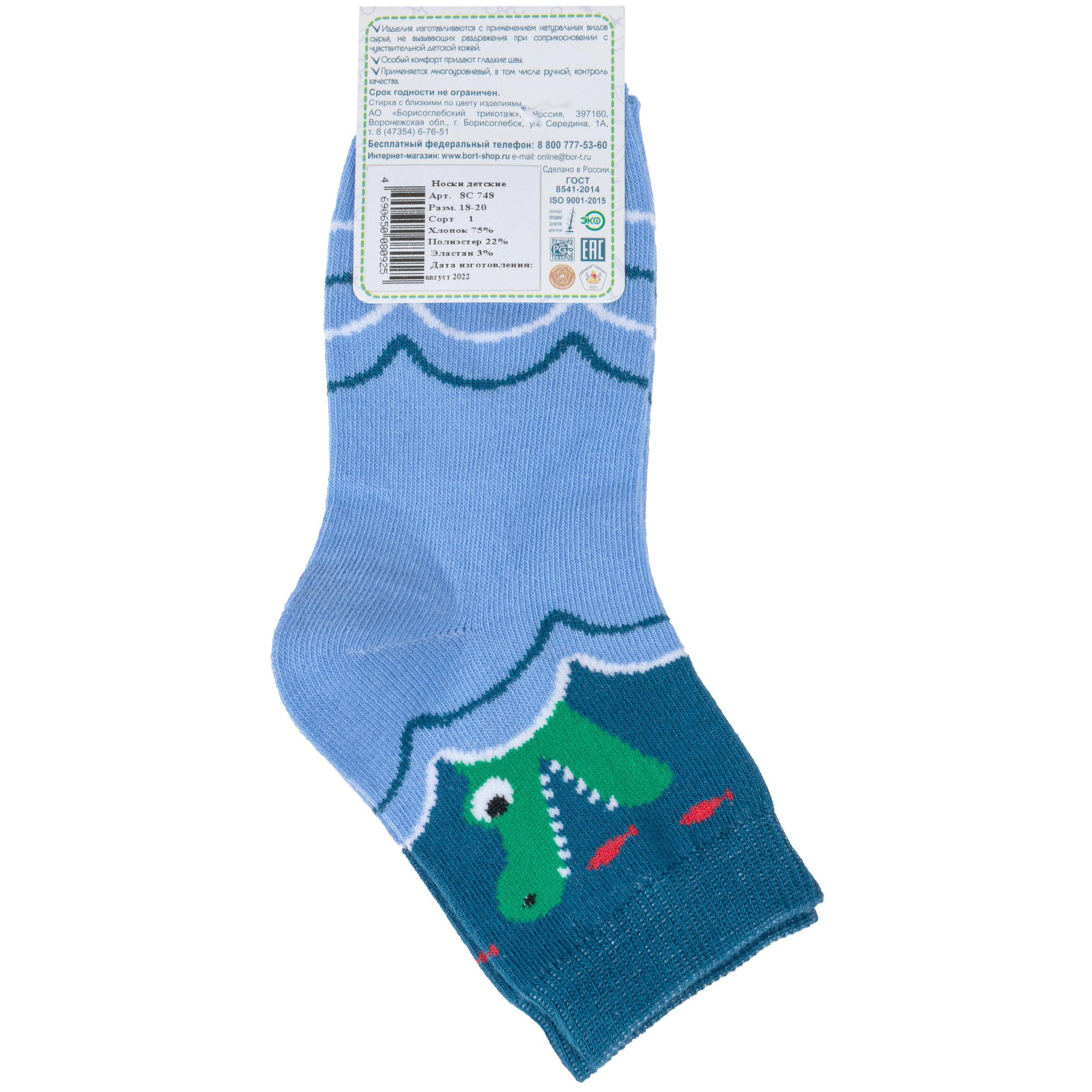 Комплект детских носков из 2 пар, круглогодичные, укороченные, цвет голубой, прикольные, состав: 75% хлопок, 22% полиэстер, 3% эластан, фабричный артикул 2-8С748. Производитель «АО Борисоглебский трикотаж, Воронежская обл, Россия» под брендом «Борисоглебский трикотаж».