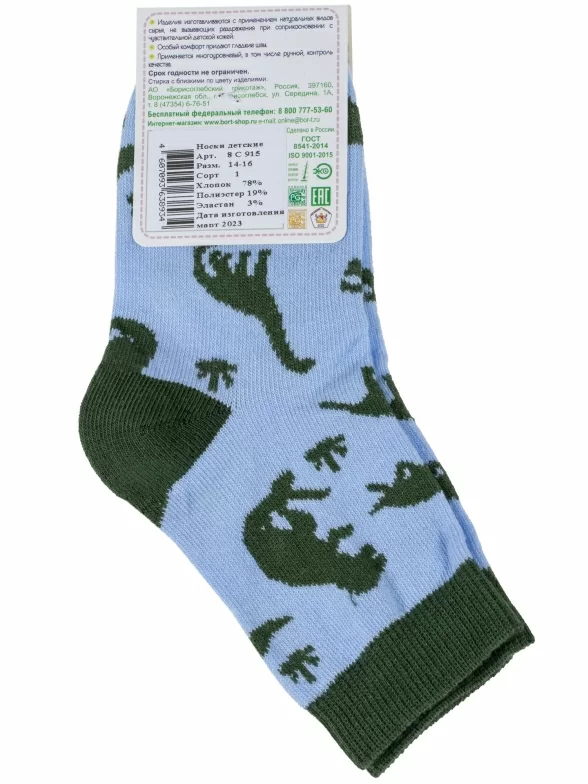 Комплект детских носков из 2 пар, круглогодичные, укороченные, цвет голубой, прикольные, состав: 78% хлопок, 19% полиэстер, 3% эластан, фабричный артикул 2-8С915. Производитель «АО Борисоглебский трикотаж, Воронежская обл, Россия» под брендом «Борисоглебский трикотаж».