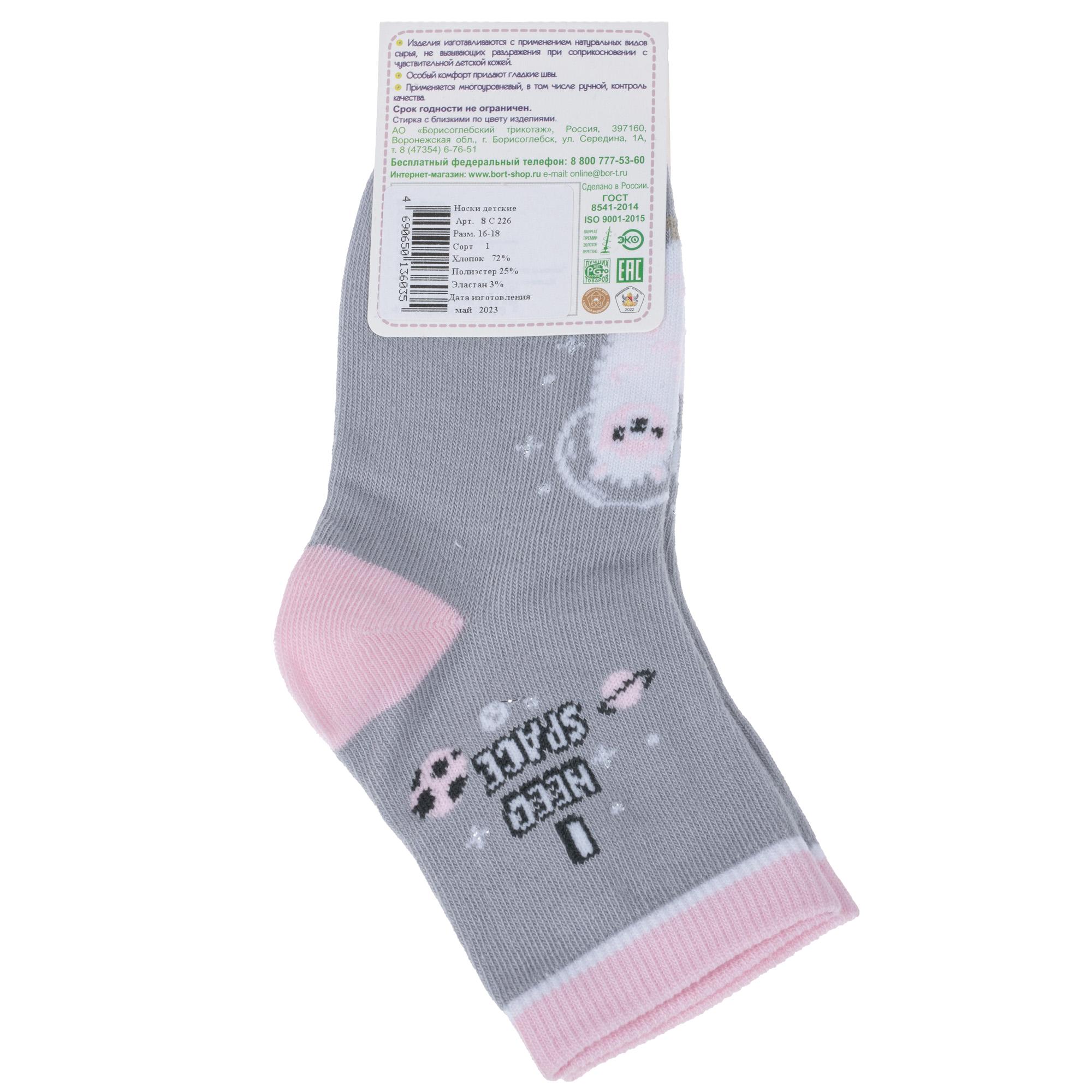 Комплект детских носков из 2 пар, круглогодичные, укороченные, цвет серый, прикольные, состав: 72% хлопок, 25% полиэстер, 3% эластан, фабричный артикул 2-8С226. Производитель «АО Борисоглебский трикотаж, Воронежская обл, Россия» под брендом «Борисоглебский трикотаж».