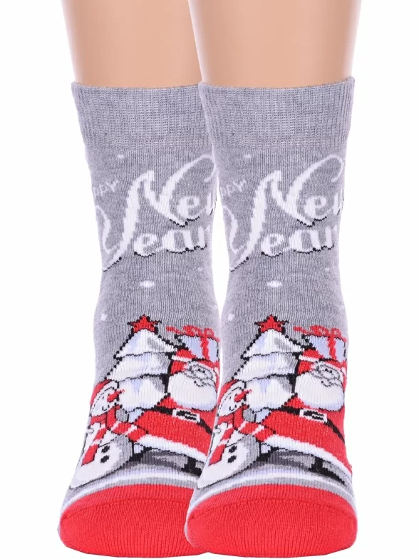 Комплект детских носков из 2 пар, круглогодичные, укороченные, цвет рис. 8011, серый меланж, повседневные, возможно бесшовные, принт (рисунок): новый год, надписи, контрастные пятка / мысок / резинка, зимний, с узором, состав: 72% хлопок, 26% полиамид, 2% эластан, арт. 2-20С3079. Производитель «Брестский чулочный комбинат ОАО, Беларусь» под брендом «Брестские (бчк)».
