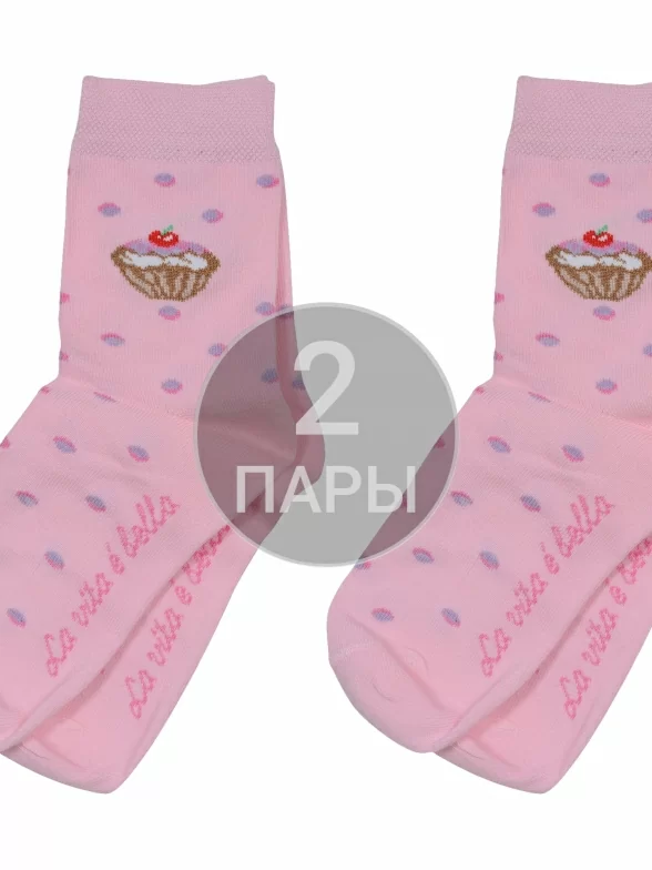 Комплект детских носков из 2 пар, круглогодичные, средней длины, цвет розовый, повседневные, шов обычный (не бесшовные), принт (рисунок): мелкий принт, горох / точка, еда и напитки, с узором, состав: 88% хлопок, 10% полиамид, 2% лайкра, арт. 2-D-3R8. Производитель «ХОХ» Россия под брендом «Хох».