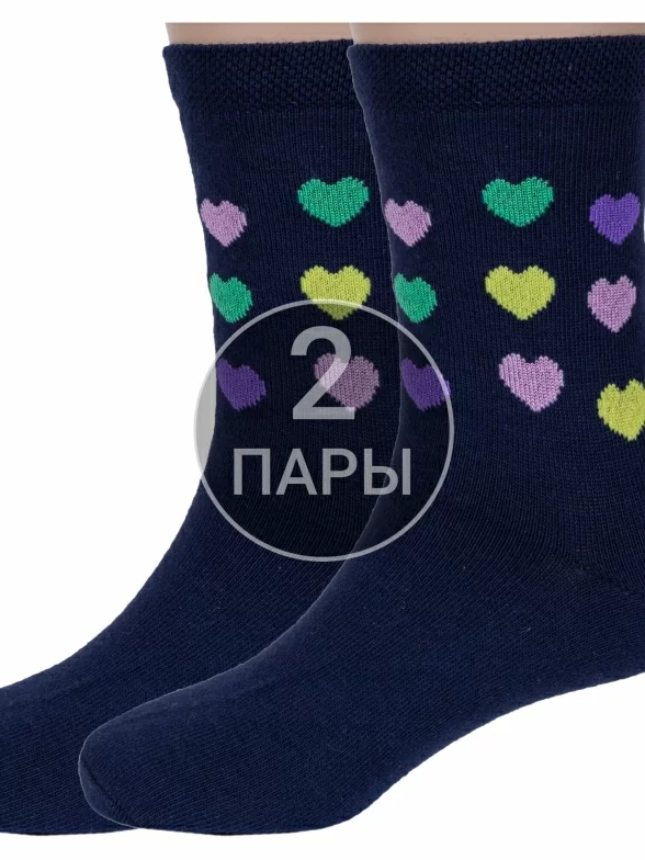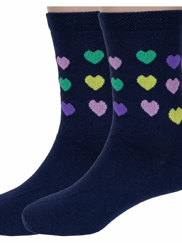 Комплект детских носков из 2 пар, круглогодичные, средней длины, цвет темно-синие, повседневные, шов обычный (не бесшовные), принт (рисунок): сердечки / поцелуи / любовь, с узором, состав: 88% хлопок, 10% полиамид, 2% лайкра, арт. 2-D-3R2. Производитель «ХОХ» Россия под брендом «Хох».