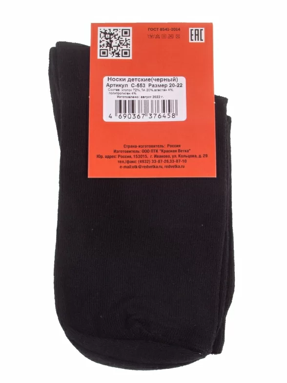 Комплект детских носков из 2 пар, круглогодичные, укороченные, цвет черный, классические, состав: 72% хлопок, 20% полиамид, 4% эластан, 4% полипропилен, фабричный артикул 2-С-553. Производитель «КРАСНАЯ ВЕТКА» Россия под брендом «Красная ветка».