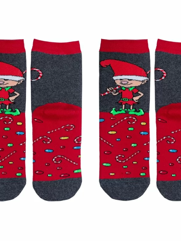 Укороченная модель с внутренней махрой и двойным бортом (манжетом резинки); украшена новогодним узором. Изготовлены в г. Иваново из хлопка с добавлением полиамида и эластана для износостойкости изделия и комфортной посадки. В состав также входит полипропилен, благодаря ему носки хорошо отводят влагу с поверхности кожи и быстро сохнут.