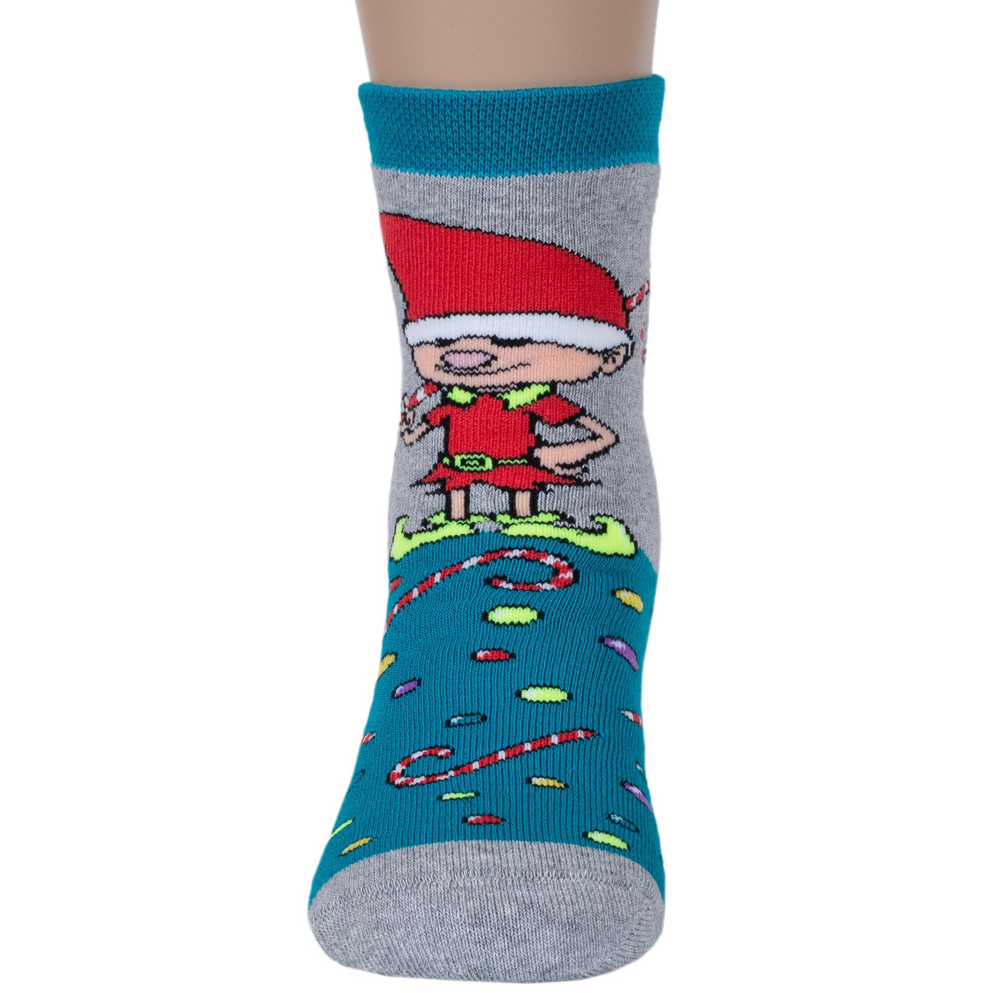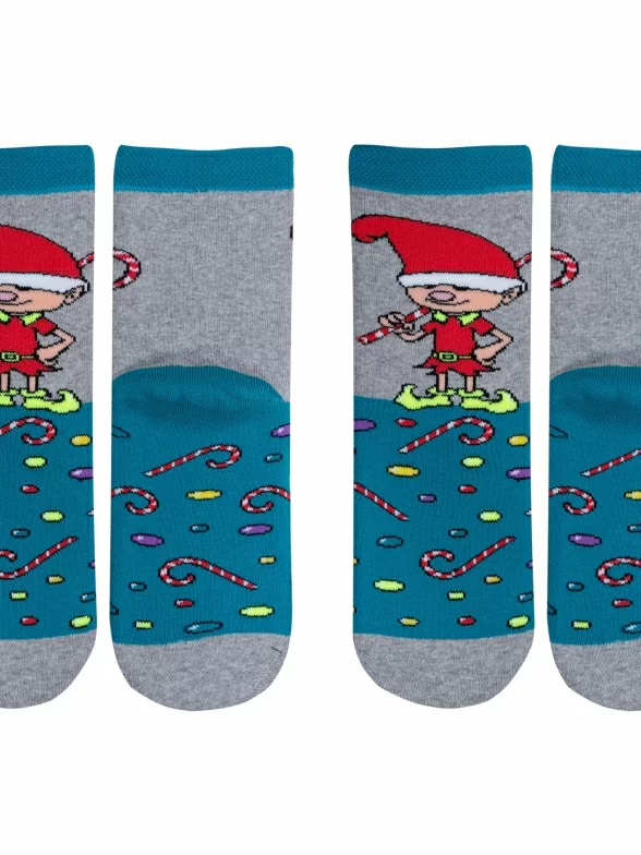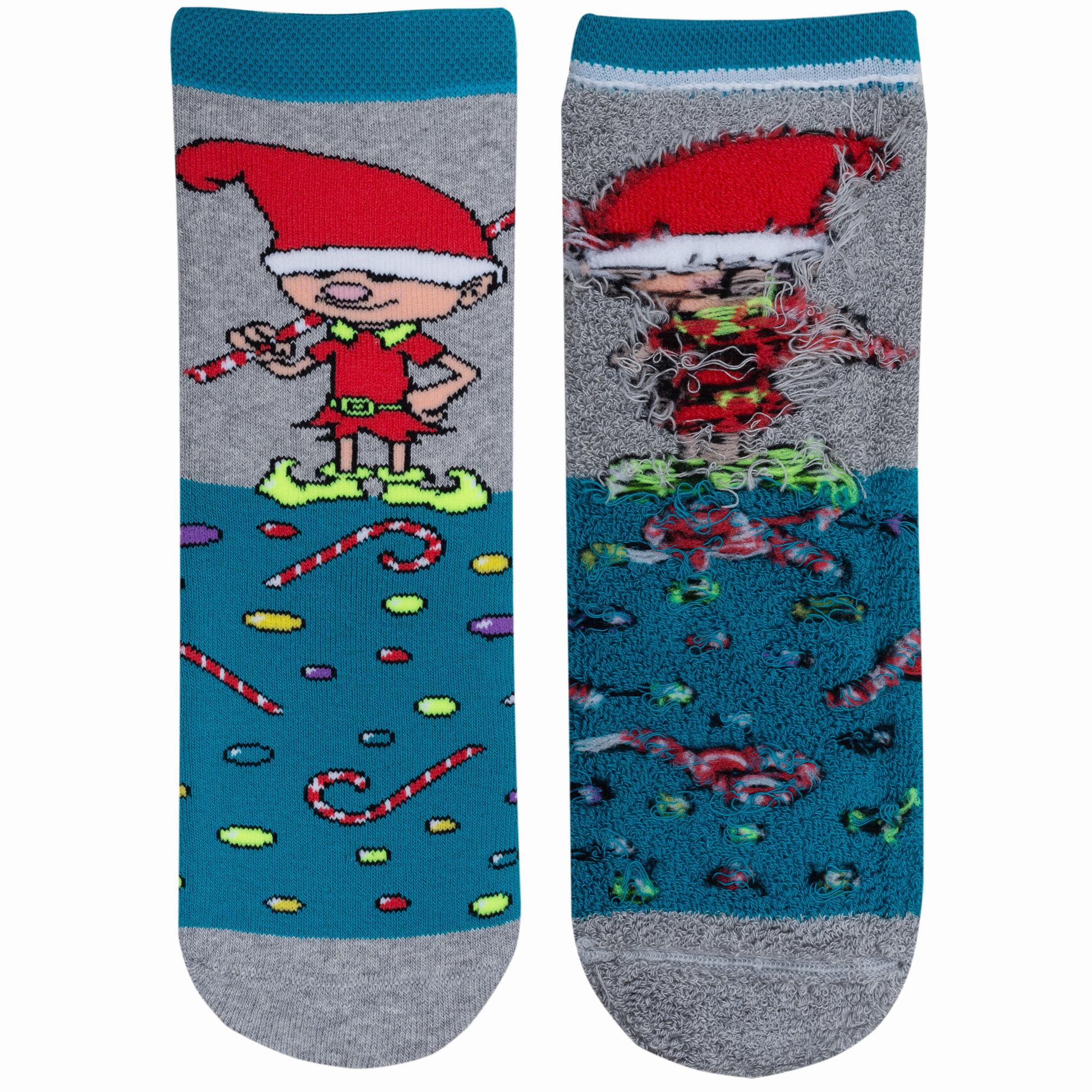 Укороченная модель с внутренней махрой и двойным бортом (манжетом резинки); украшена новогодним узором. Изготовлены в г. Иваново из хлопка с добавлением полиамида и эластана для износостойкости изделия и комфортной посадки. В состав также входит полипропилен, благодаря ему носки хорошо отводят влагу с поверхности кожи и быстро сохнут.
