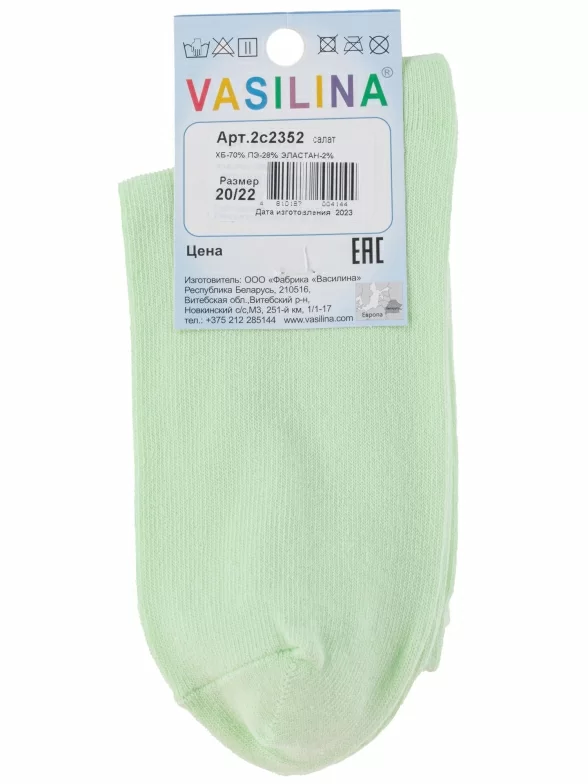 Комплект детских носков из 2 пар, круглогодичные, укороченные, цвет салатовый, прикольные, состав: 70% хлопок, 28% полиэстер, 2% эластан, фабричный артикул 2-2С2352. Производитель «ООО Фабрика Василина, Беларусь» под брендом «Vasilina».