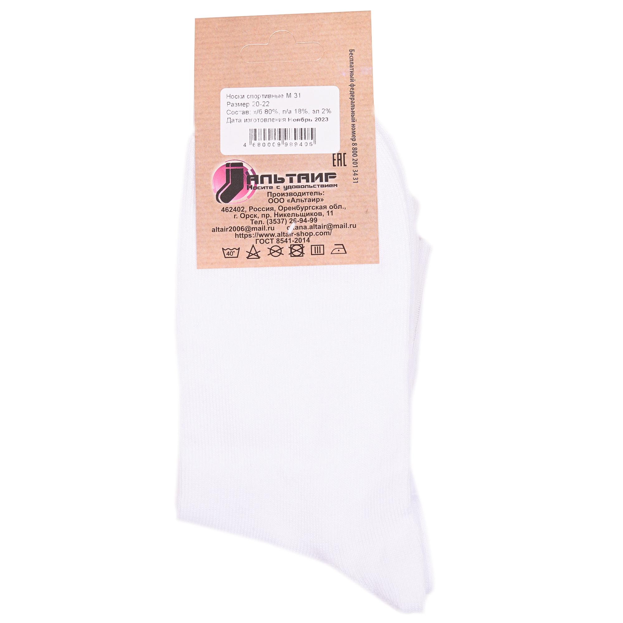 Комплект детских носков из 2 пар, круглогодичные, укороченные, цвет белый, спортивные, шов обычный (не бесшовные), принт (рисунок): однотонный, без рисунков/узоров, состав: 80% хлопок, 18% полиамид, 2% эластан, арт. 2-М31. Производитель «ООО Альтаир, г. Орск, Оренбургская обл, Россия» под брендом «Альтаир».