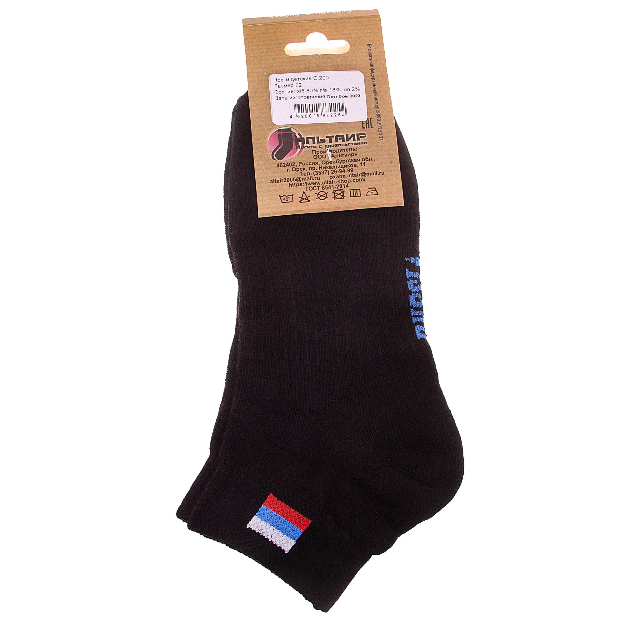Комплект детских носков из 2 пар, круглогодичные, укороченные, цвет черный, спортивные, шов обычный (не бесшовные), принт (рисунок): однотонный, небольшой рисунок, состав: 80% хлопок, 18% полиамид, 2% эластан, арт. 2-С200. Производитель «ООО Альтаир, г. Орск, Оренбургская обл, Россия» под брендом «Альтаир».