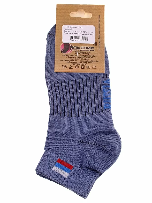 Комплект детских носков из 2 пар, круглогодичные, укороченные, цвет джинсовый, спортивные, состав: 80% хлопок, 18% полиамид, 2% эластан, арт. 2-С200. Производитель «ООО Альтаир, г. Орск, Оренбургская обл, Россия» под брендом «Альтаир».
