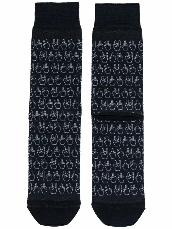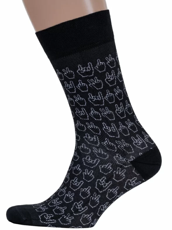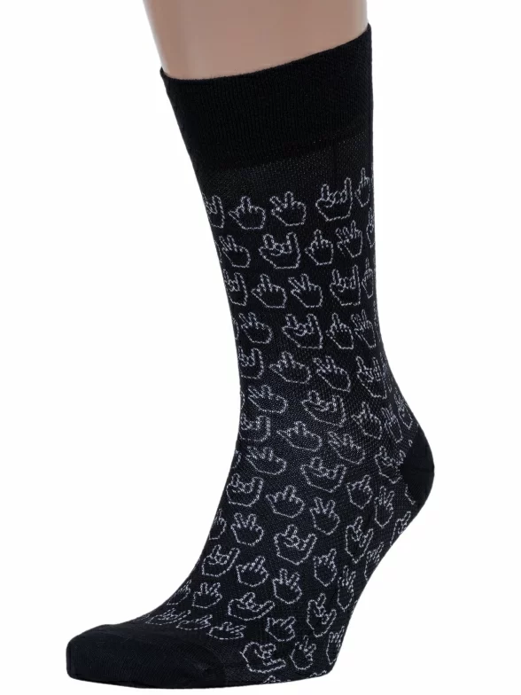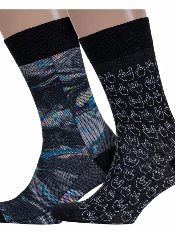 Комплект мужских носков: одна пара с принтом в виде разных жестов, другая - с радужными разводами.